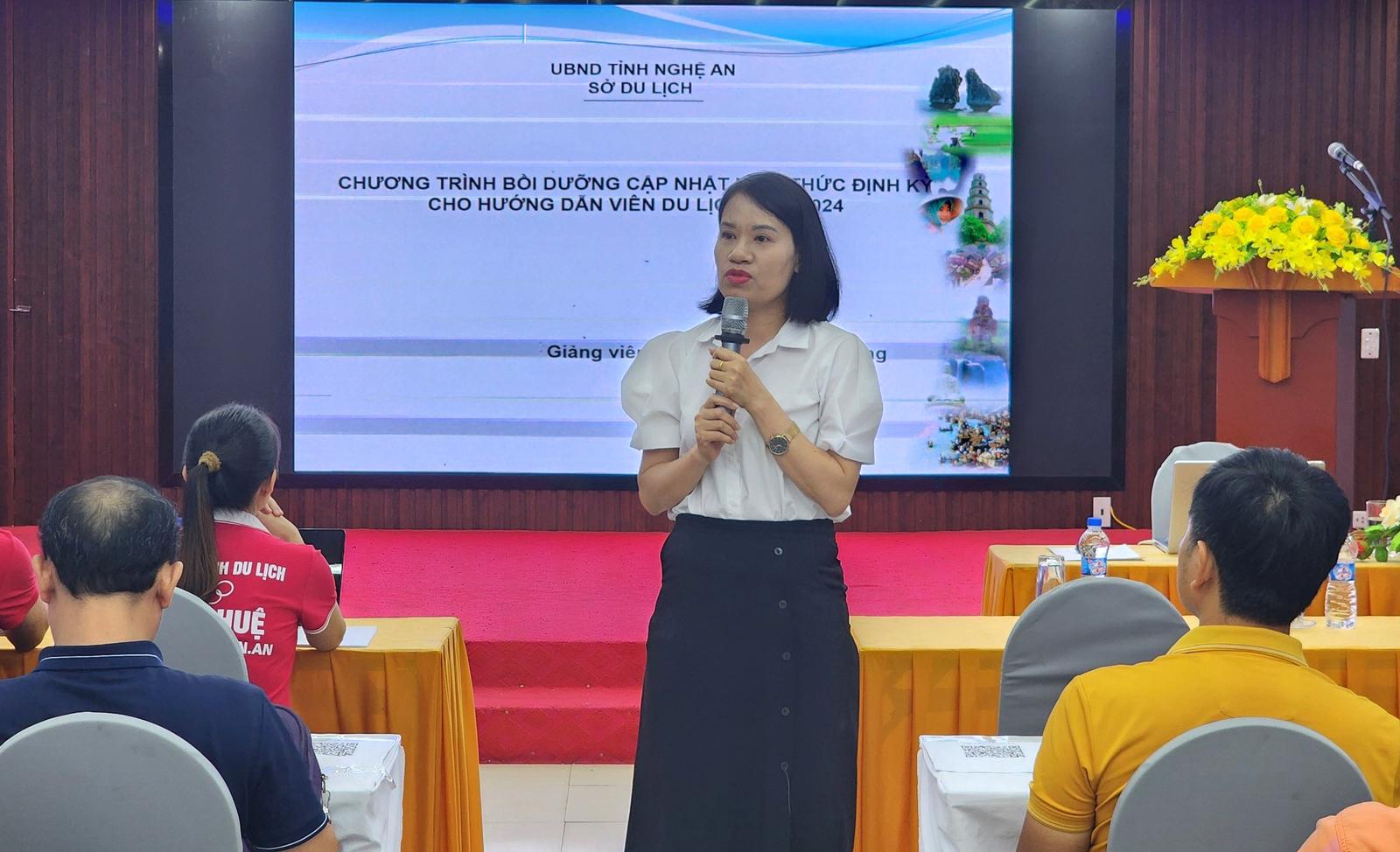 Tham gia khóa cập nhật kiến thức, các hướng dẫn viên được các giảng viên bồi dưỡng, chia sẻ, tập huấn các nội dung bao gồm: Tình hình du lịch thế giới, xu thế và triển vọng, tình hình kinh tế chính trị, xã hội của đất nước, hệ thống các văn bản pháp luật mới liên quan đến du lịch, hệ thống tổ chức quản lý nNhà nước về du lịch Việt Nam và tỉnh Nghệ An; tình hình phát triển du lịch, thông tin về sản phẩm du lịch mới, sản phẩm du lịch chủ đạo của Việt Nam và tỉnh Nghệ An, các biện pháp đảm bảo an ninh, an toàn cho khách du lịch.