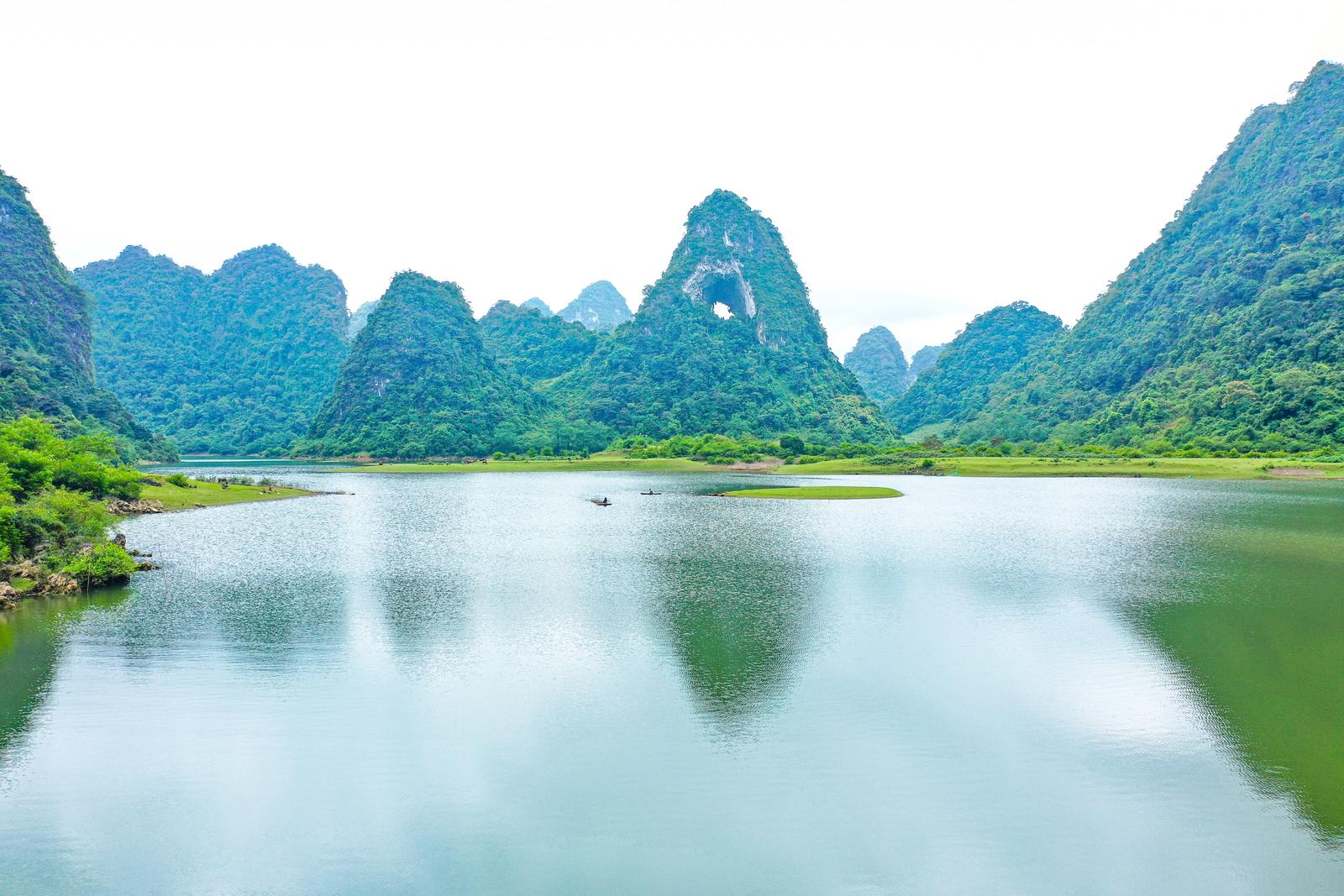 Núi Mắt Thần nằm gọn trong lòng thung lũng giữa quần thể hồ Thang Hen của Công viên địa chất non nước Cao Bằng, nơi có khung cảnh vô cùng quyến rũ. Ảnh: CB