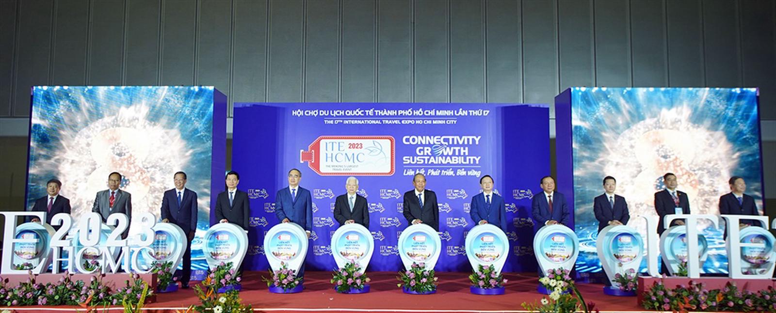 Các đại biểu thực hiện nghi lễ khai mạc Hội chợ Du lịch quốc tế TP Hồ Chí Minh năm 2023. Ảnh: PV
