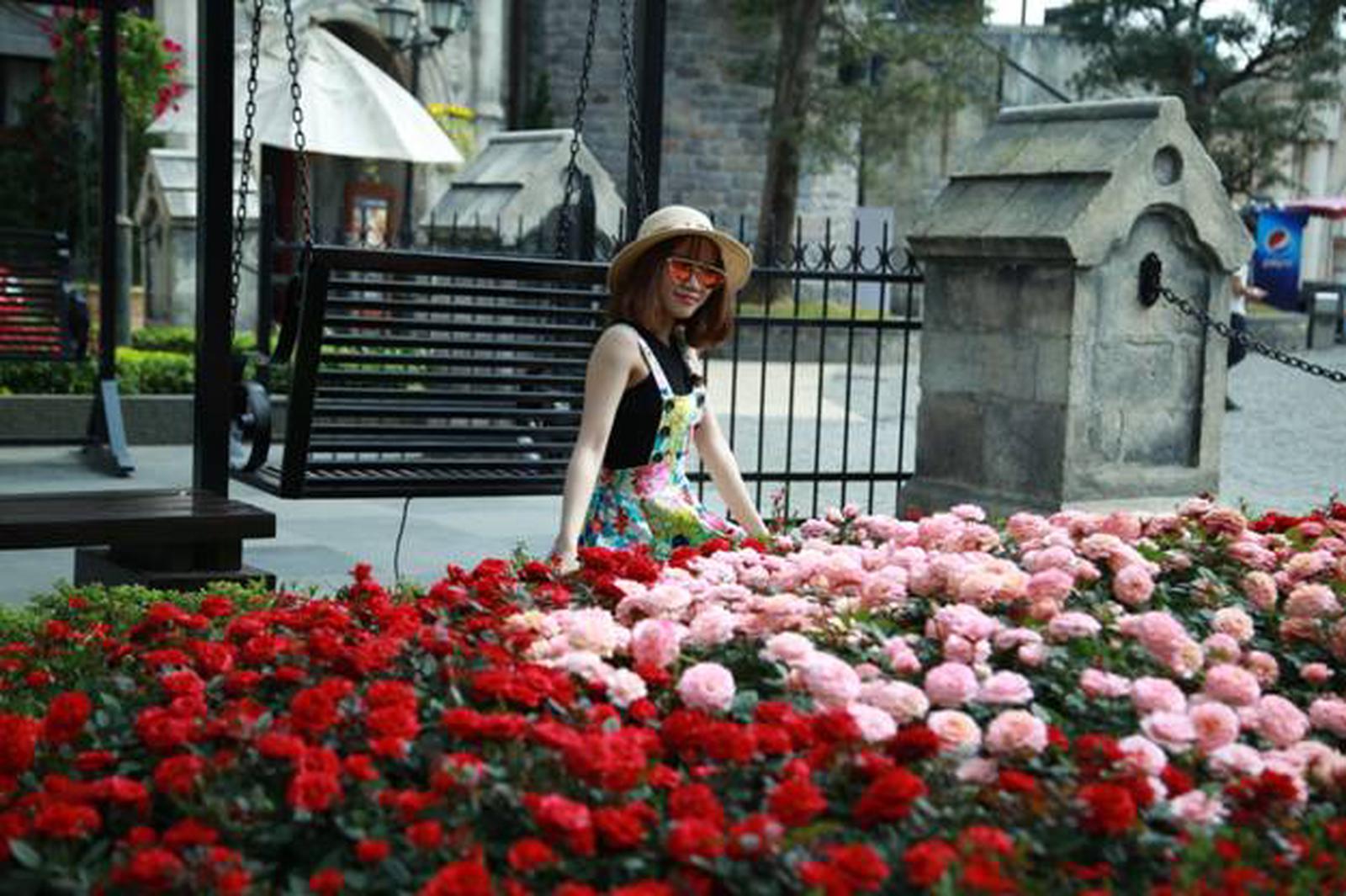 Thảm hoa hồng trước đài phun nước khiến du khách mê mải ngắm nhìn, chụp hình. Để những loài hồng quý nở rực rỡ, người Bà Nà đã phải kỳ công lắm, bởi không phải hoa hồng nào cũng có thể chống chọi được với thời tiết giá lạnh, sương mù khắc nghiệt trên đỉnh cao này.