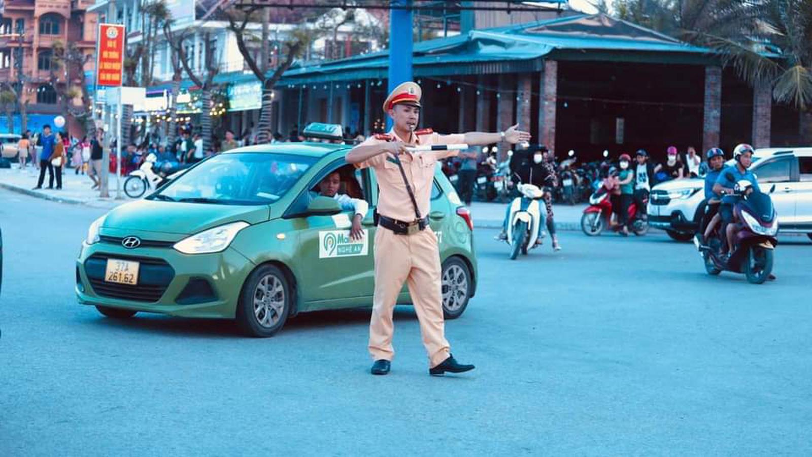 Lực lượng cảnh sát giao thông phân luồng, điều tiết giao thông cho du khách khi về với phổ biển an toàn, thông suốt. Ảnh: NA