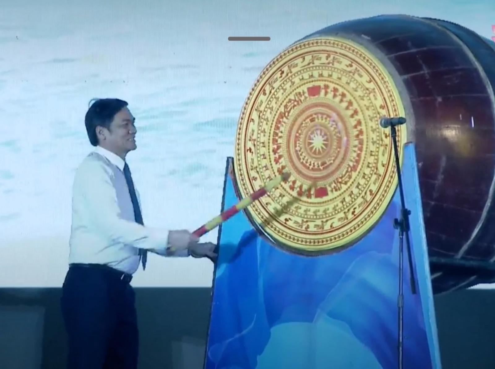 Ông Hoàng Nghĩa Hiếu đánh trống khai hội du lịch Cửa Lò 2024. Ảnh: XT