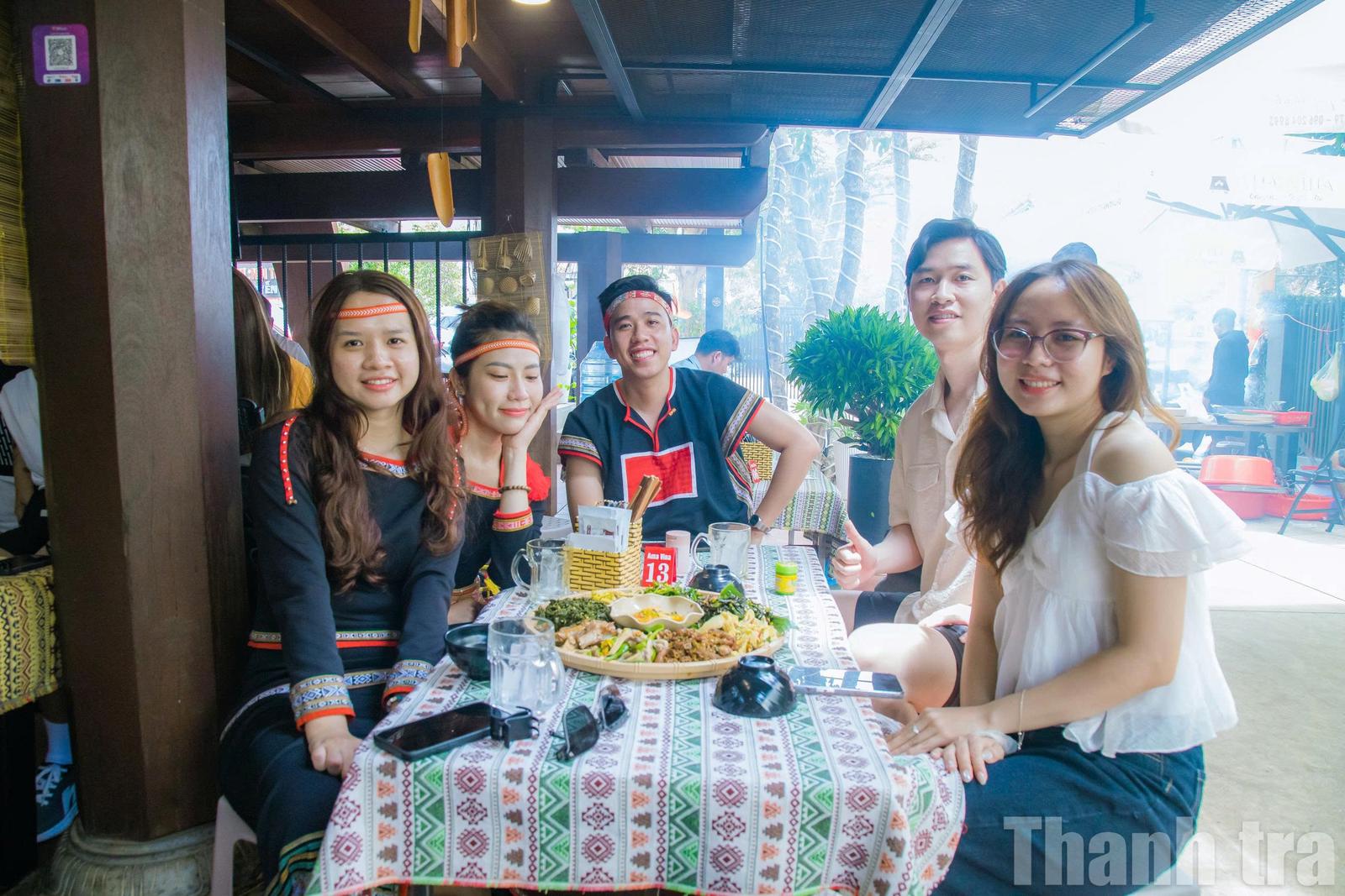 Du khách trải nghiệm ẩm thực truyền thống của dân tộc Êđê. Ảnh: CN