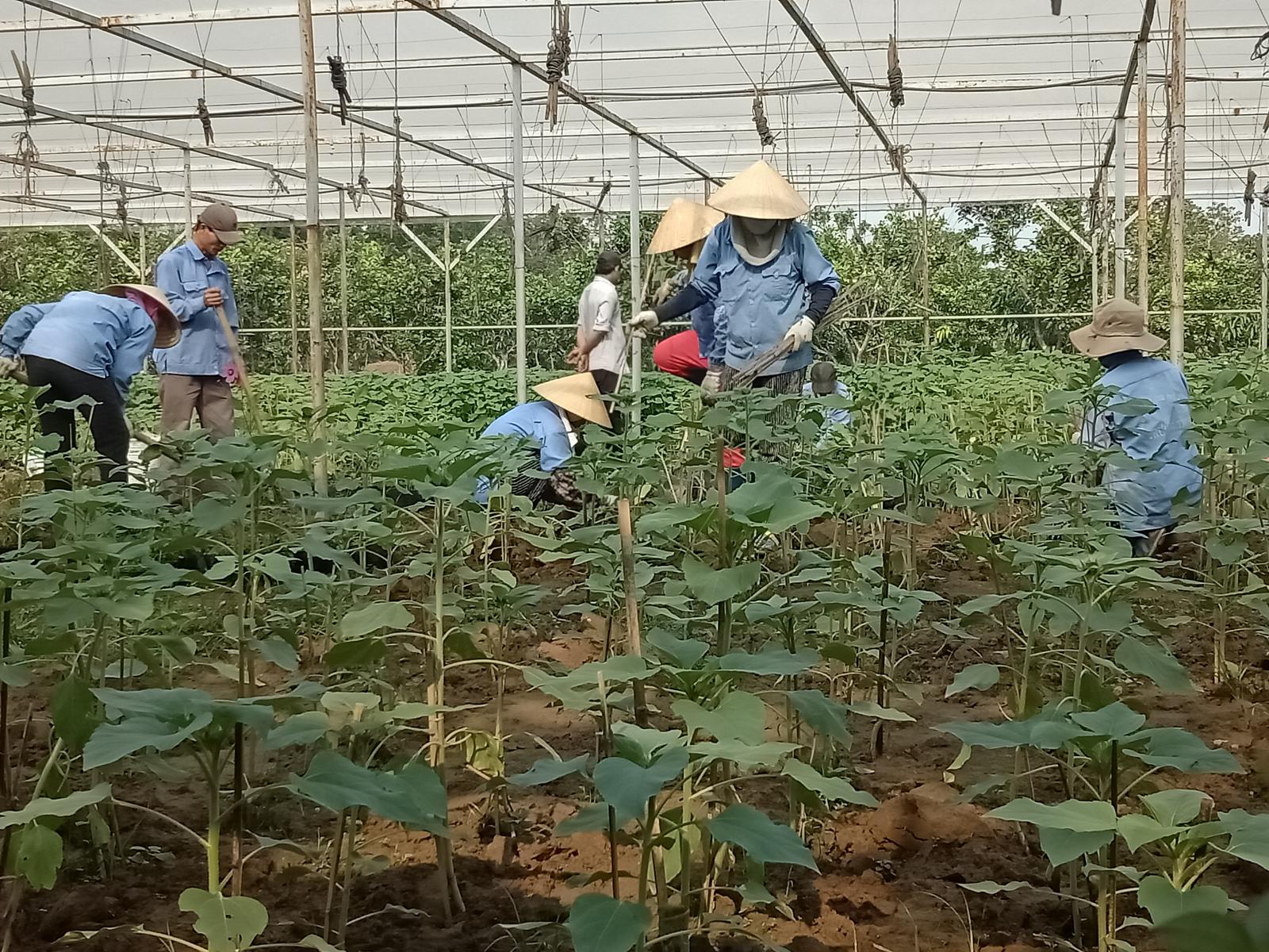 Công nhân đang tất bật chăm sóc vườn hoa hướng dương cho nở vào dịp Tết Âm lịch Canh Tý. Ảnh: VT