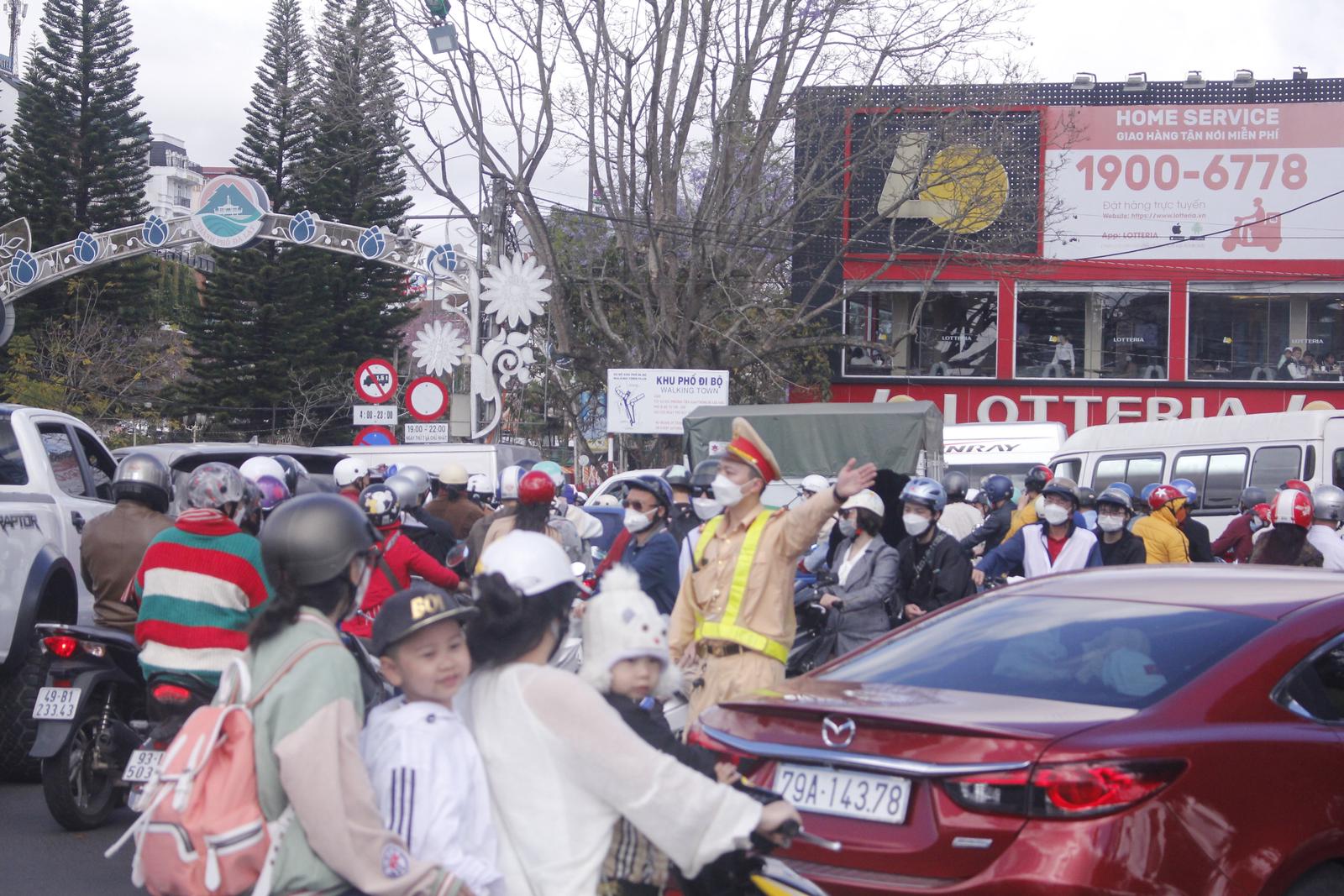 Lực lượng Công an TP Đà Lạt phải căng mình điều tiết giao thông. Ảnh: Vũ Linh