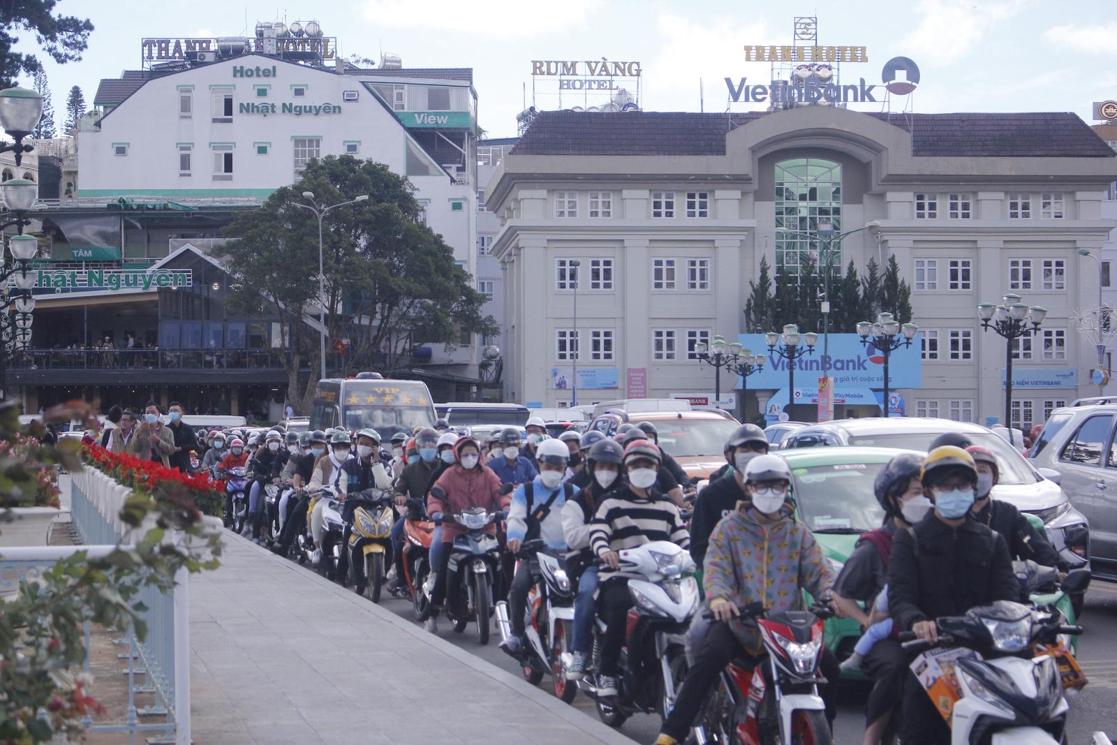 Sáng ngày 4 Tết, theo ghi nhận của chúng tôi, lượng phượng tiên đổ về hướng trung tâm TP Đà Lạt tăng đột biến. Du khách lên Đà Lạt du Xuân chủ yếu bằng xe ô tô cá nhân và một lượng lớn xe mô tô. Tại các nút giao thông trọng điểm, các đoàn xe nối thành đoàn dài và di chuyển khá chậm để vào được trung tâm TP.