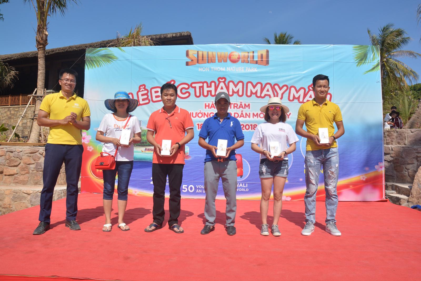 Cơ cấu giải thưởng gồm 10 giải đặc biệt, 50 giải nhất, 200 giải nhì, 500 giải ba. Giá trị tương ứng của các giải thưởng là 10 chiếc điện thoại Iphone X, 50 điện thoại Oppo, 200 vali Sun World, 200 voucher cáp treo và 500 voucher ăn uống tại hệ thống nhà hàng thuộc Tổ hợp vui chơi giải trí Sun World Hon Thom Nature Park. Tổng giá trị giải thưởng của toàn bộ chương trình lên tới 450.000.000 đồng. Các chương trình bốc thăm trúng thưởng đã diễn ra trang trọng, công khai, minh bạch với hơn 70 phần quà giá trị được trao cho du khách may mắn mỗi ngày.