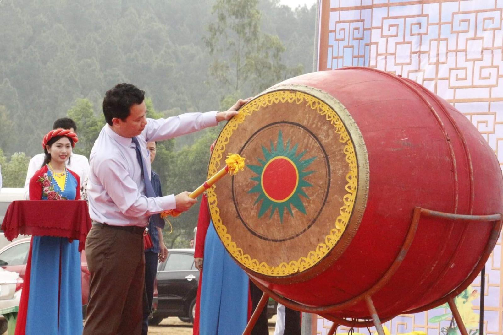Chủ tịch UBND tỉnh Hà Tĩnh Đặng Quốc Khánh đã đánh những tiếng trống đầu tiên, chính thức khai hội chùa Hương Tích 2019. Ảnh: HY