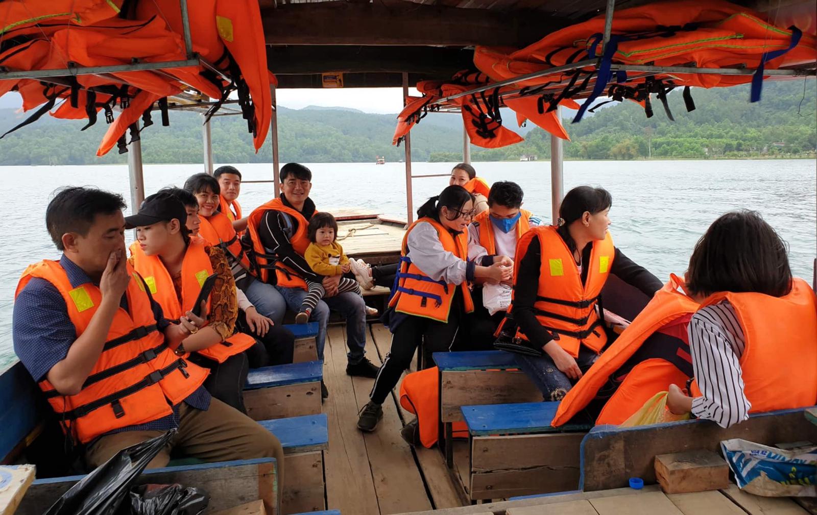 Du khách đi lên chùa bằng đường thuỷ phải bắt buộc mặc áo phao cứu sinh và thuyền chở khách cam kết không được chở quá số người quy định, đảm bảo an toàn cho du khách đi tham quan. Ảnh: HY