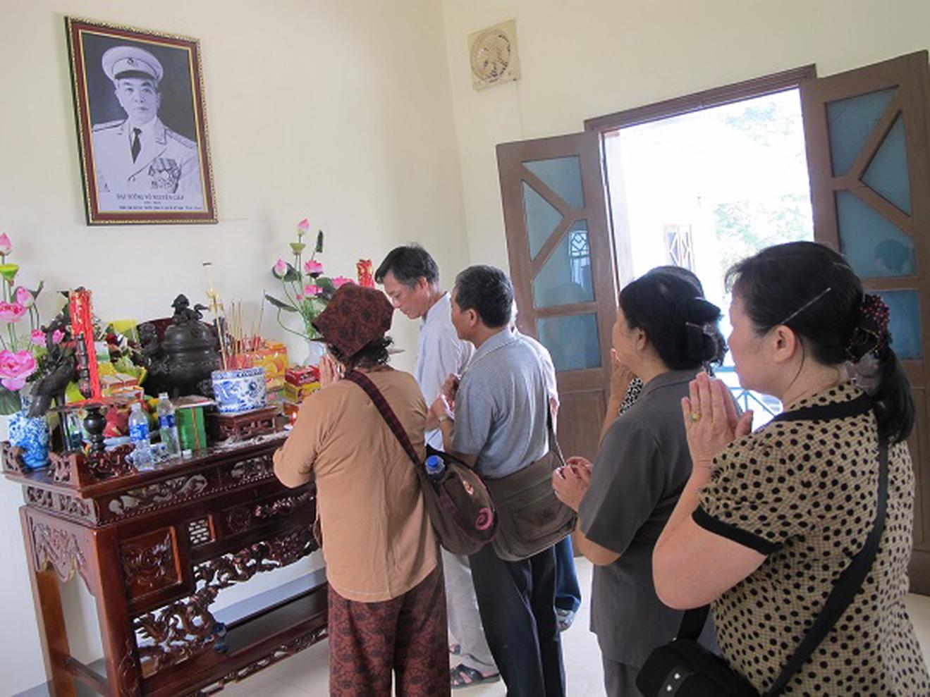 Tại Khu Di tích Sở Chỉ huy Chiến dịch Điện Biên Phủ, những ngày này, các chị hướng dẫn viên người dân tộc Thái tất bật hướng dẫn từng đoàn khách lên dâng hoa, thắp hương Đại tướng Võ Nguyên Giáp. Chị Cà Thị Minh cho biết, bàn thờ Đại tướng được đặt trên tầng 2 nhà lưu niệm của Khu Di tích. Sau khi thắp hương trên bàn thờ Đại tướng, du khách mới vào thăm Sở Chỉ huy Chiến dịch Điện Biên Phủ.