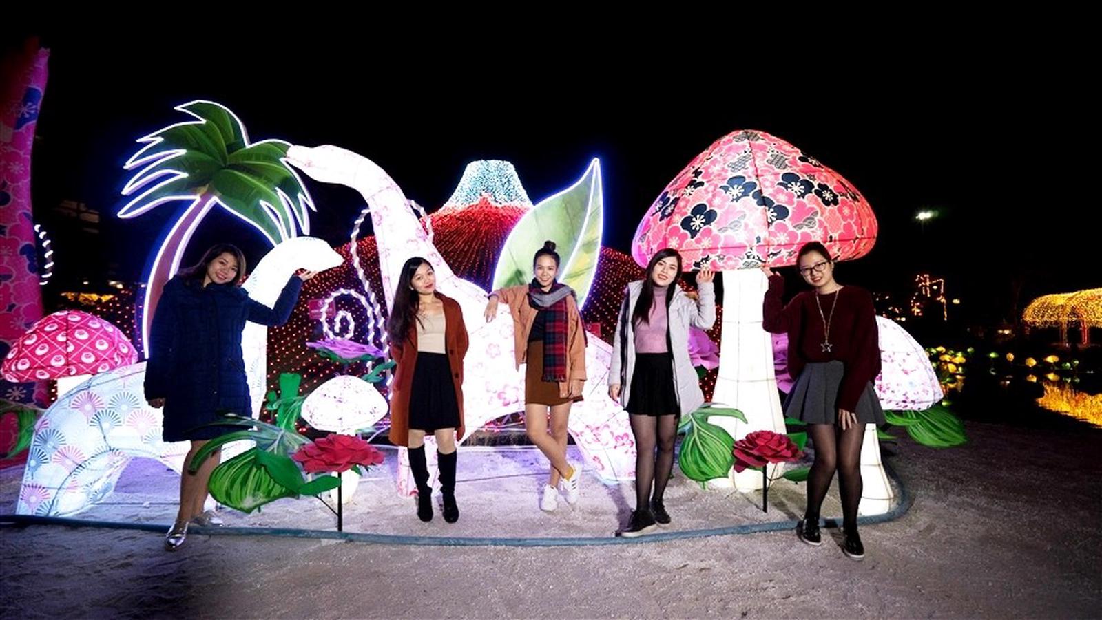 Ngoài các nhân vật quen thuộc như ông già Noel, tuần lộc nhung vàng hay người Tuyết…Giáng sinh nơi đây mang đậm phong cách Nhật Bản khiến giới trẻ “phát sốt” với điểm nhấn độc đáo ở khu vực Ba Đèo: Ngọn đồi ánh sáng lộng lẫy với hàng ngàn bóng đèn đủ sắc màu, đường hầm ánh sáng được thắp bởi dải đèn led sặc sỡ và những chiếc đèn lồng cá koi, khủng long độc đáo…