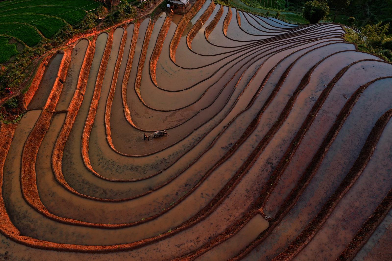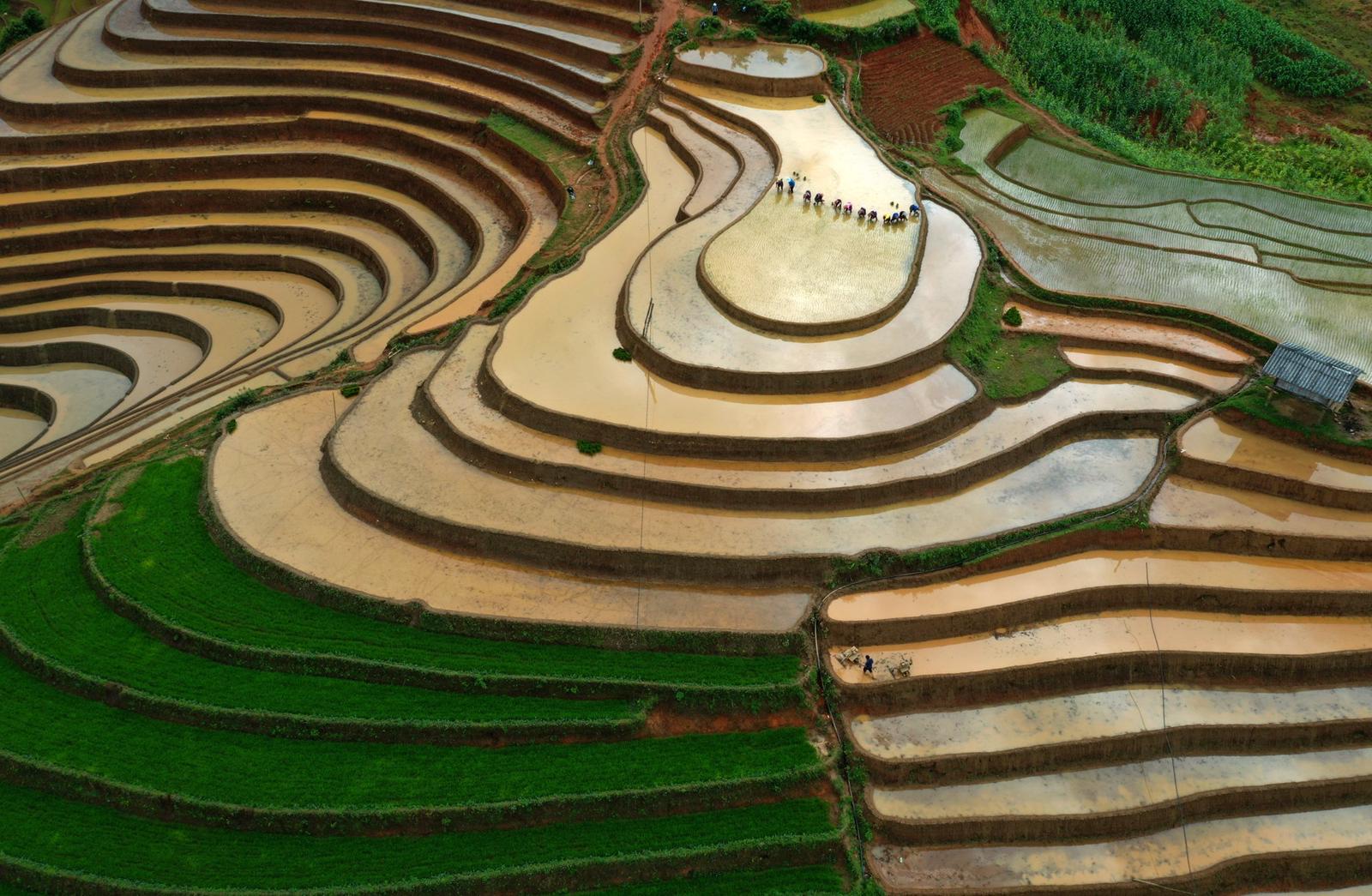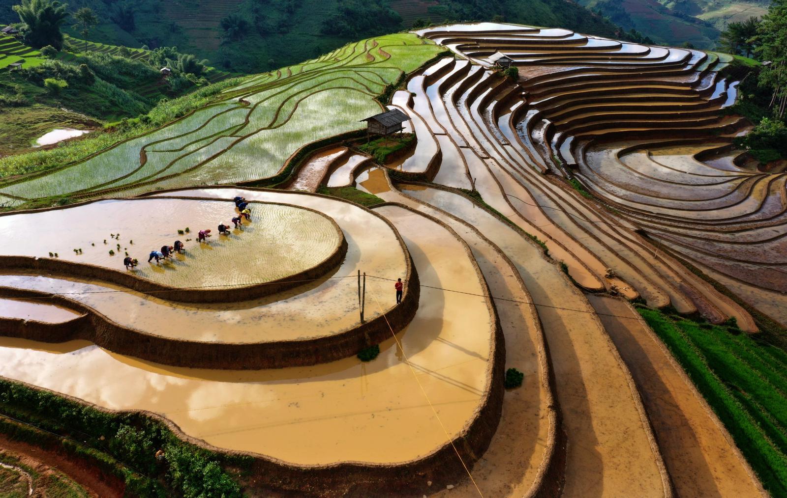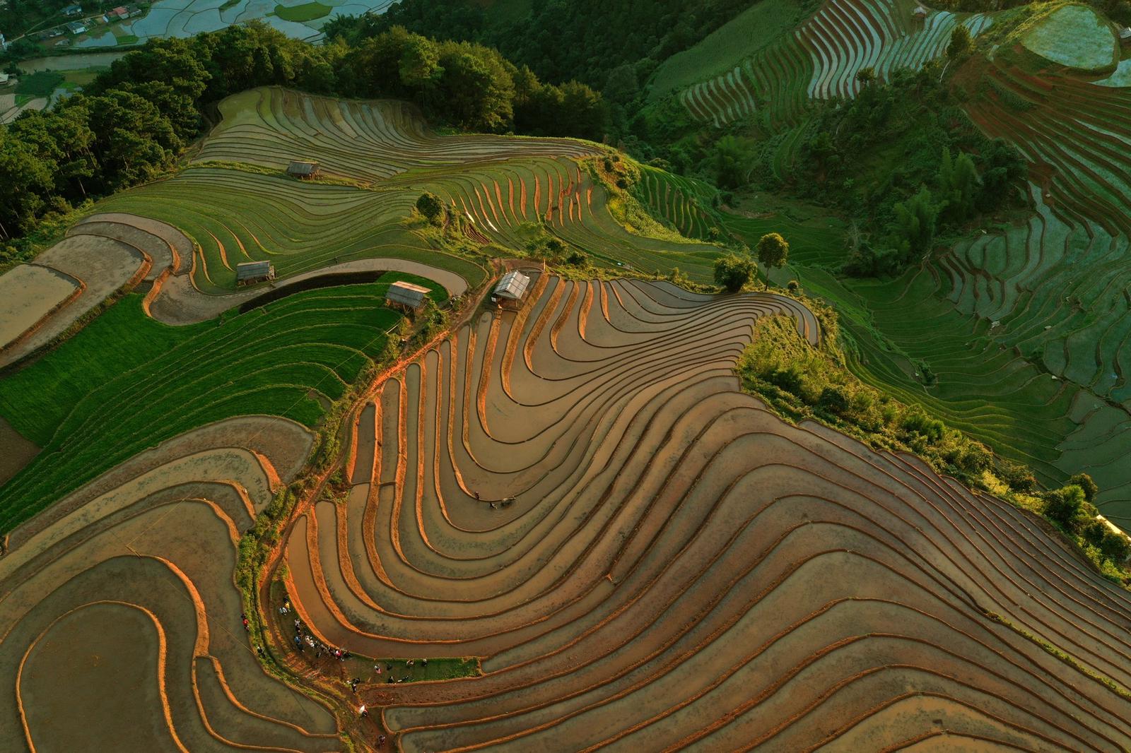 Những thửa ruộng mới cấy xanh rì, đan xen cùng luống đất nâu lóng lánh nước. Ruộng bậc thang là sự kết hợp hoàn hảo giữa vẻ hùng vĩ của núi rừng cùng vẻ đẹp của lao động sáng tạo, trải qua bao đời, bao thế hệ.