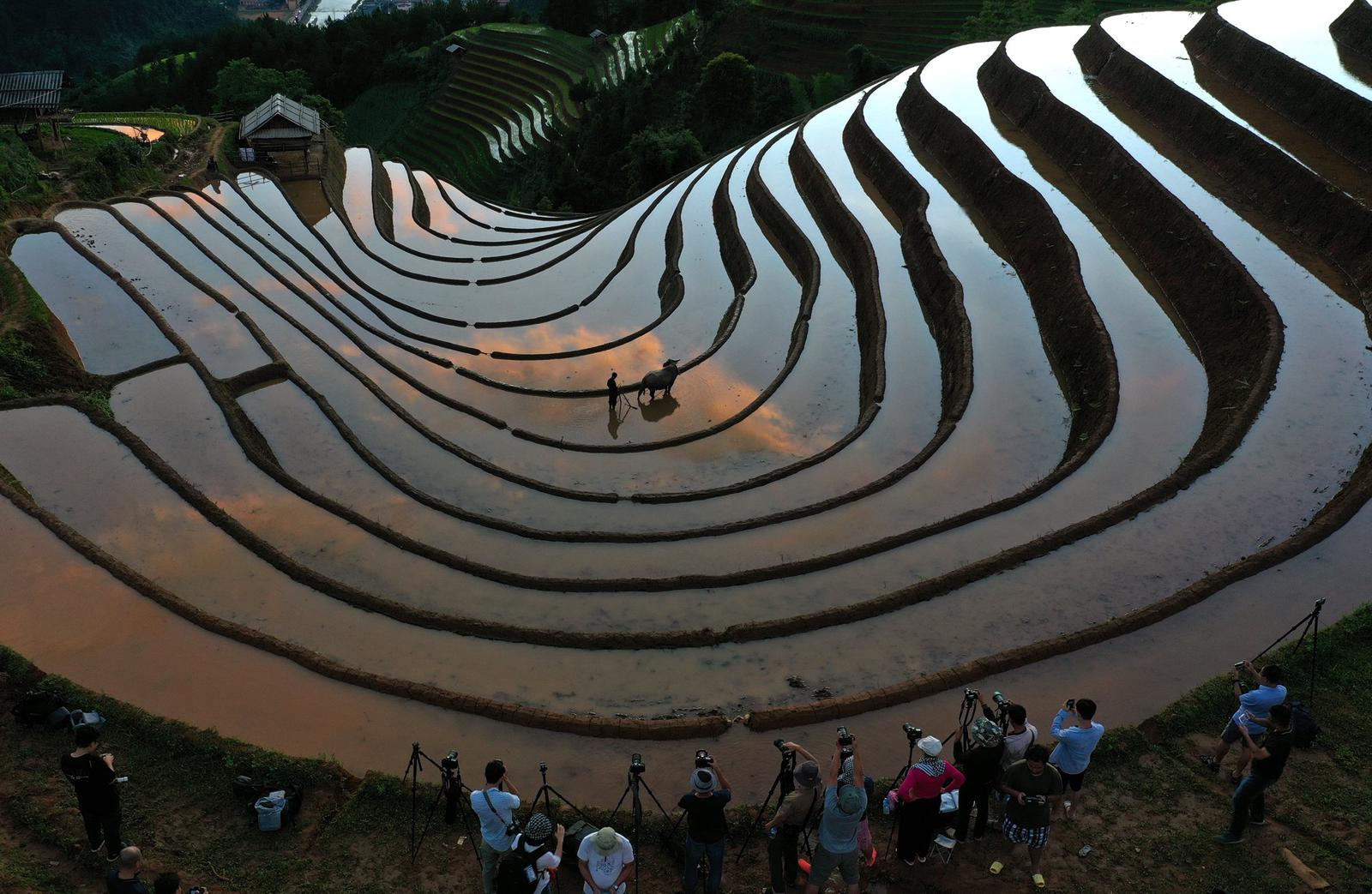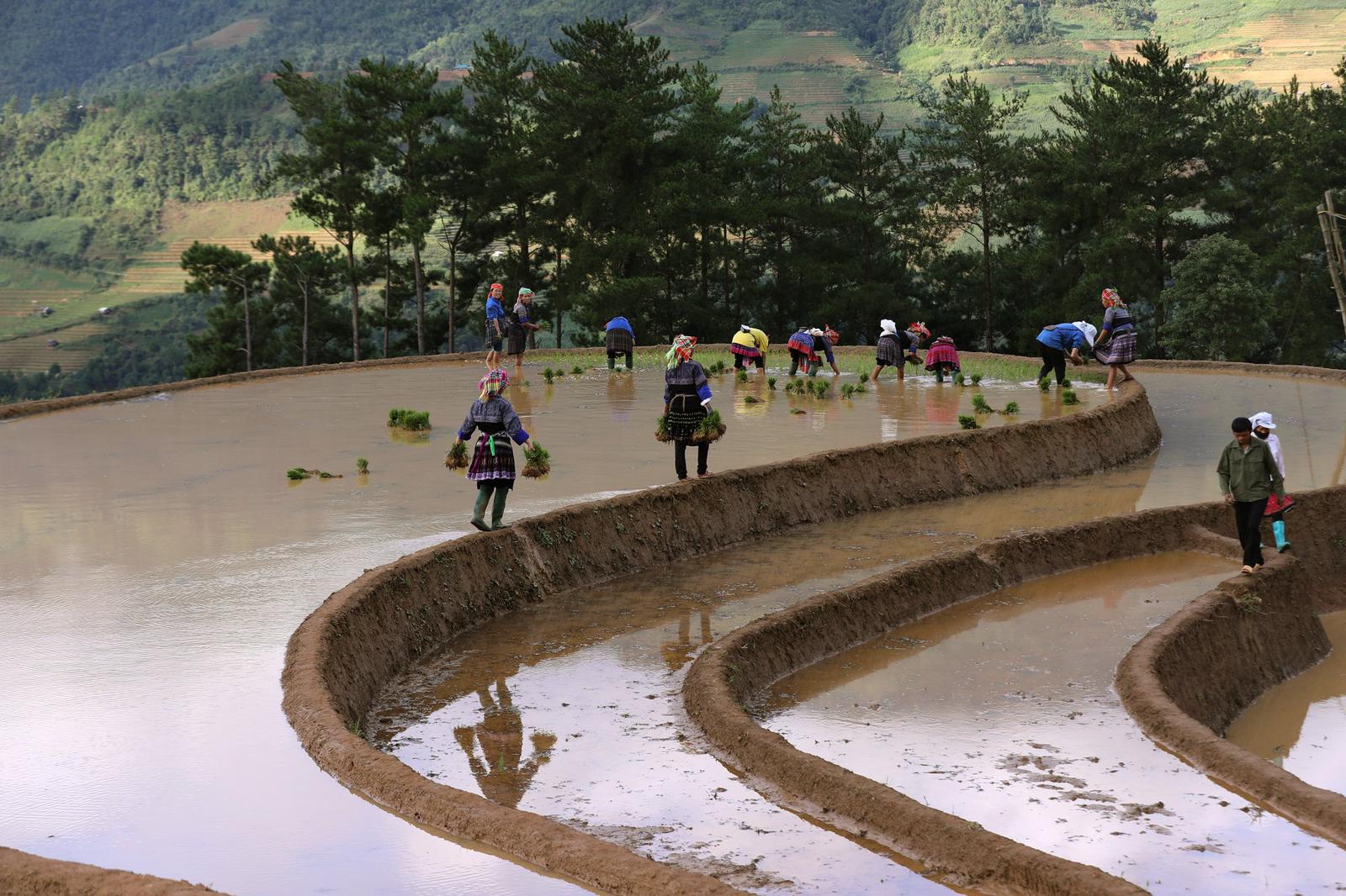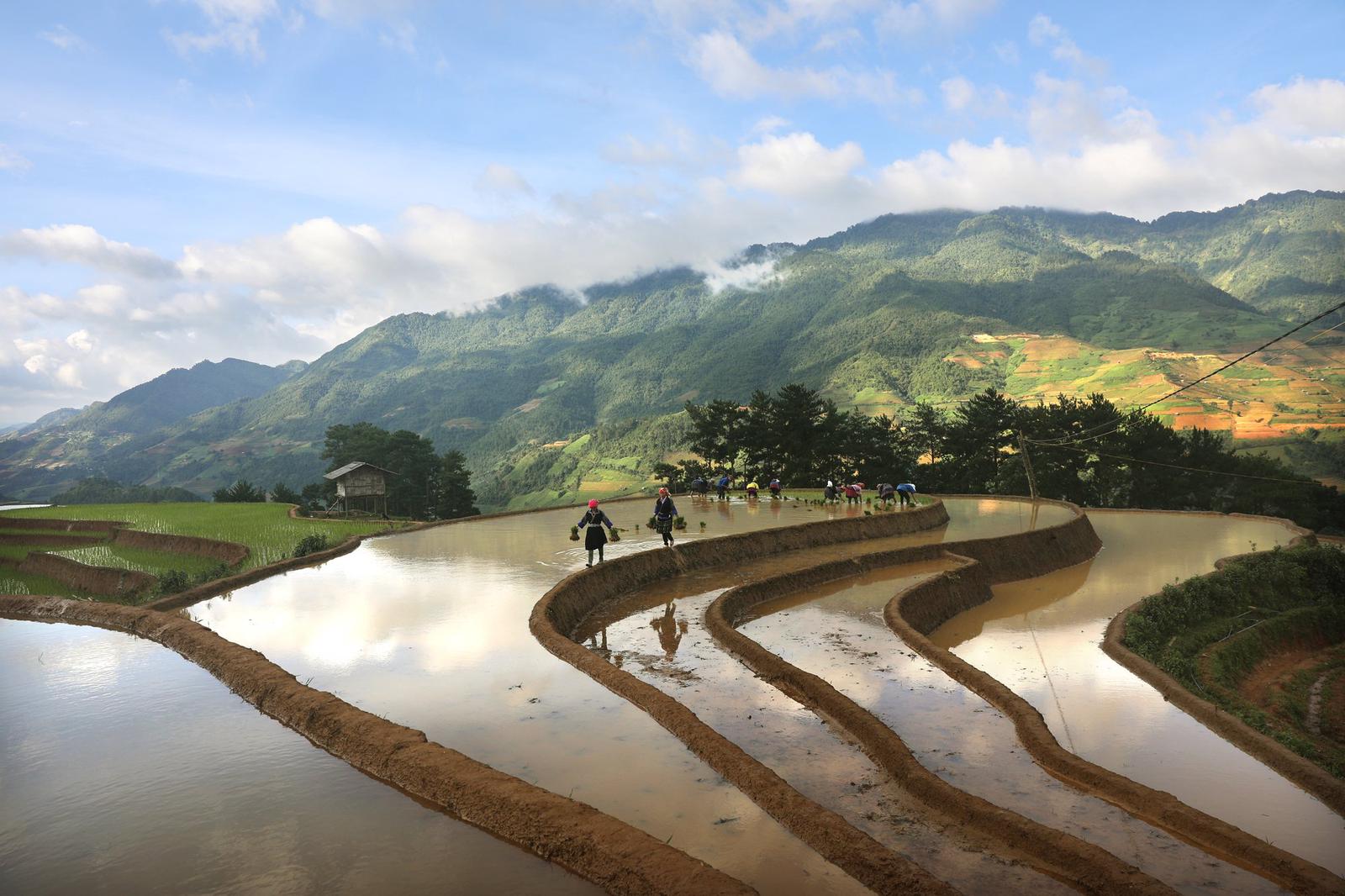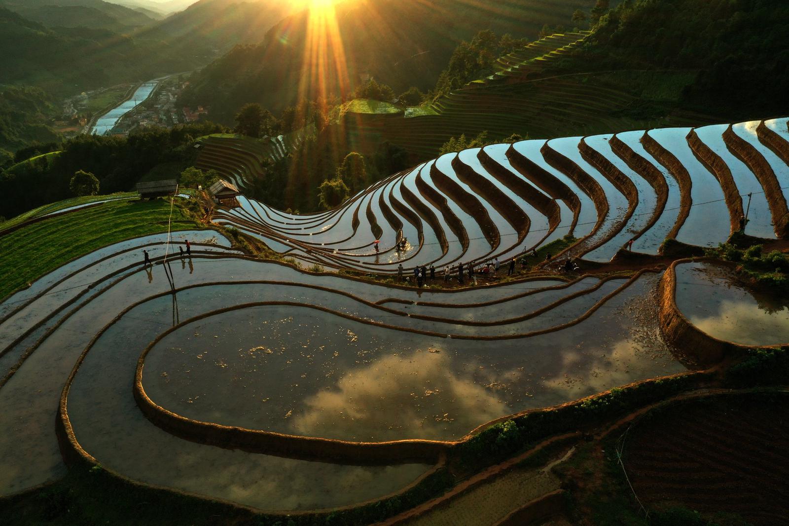 Những thửa ruộng mới cấy xanh rì, đan xen cùng luống đất nâu lóng lánh nước. Ruộng bậc thang là sự kết hợp hoàn hảo giữa vẻ hùng vĩ của núi rừng cùng vẻ đẹp của lao động sáng tạo, trải qua bao đời, bao thế hệ.