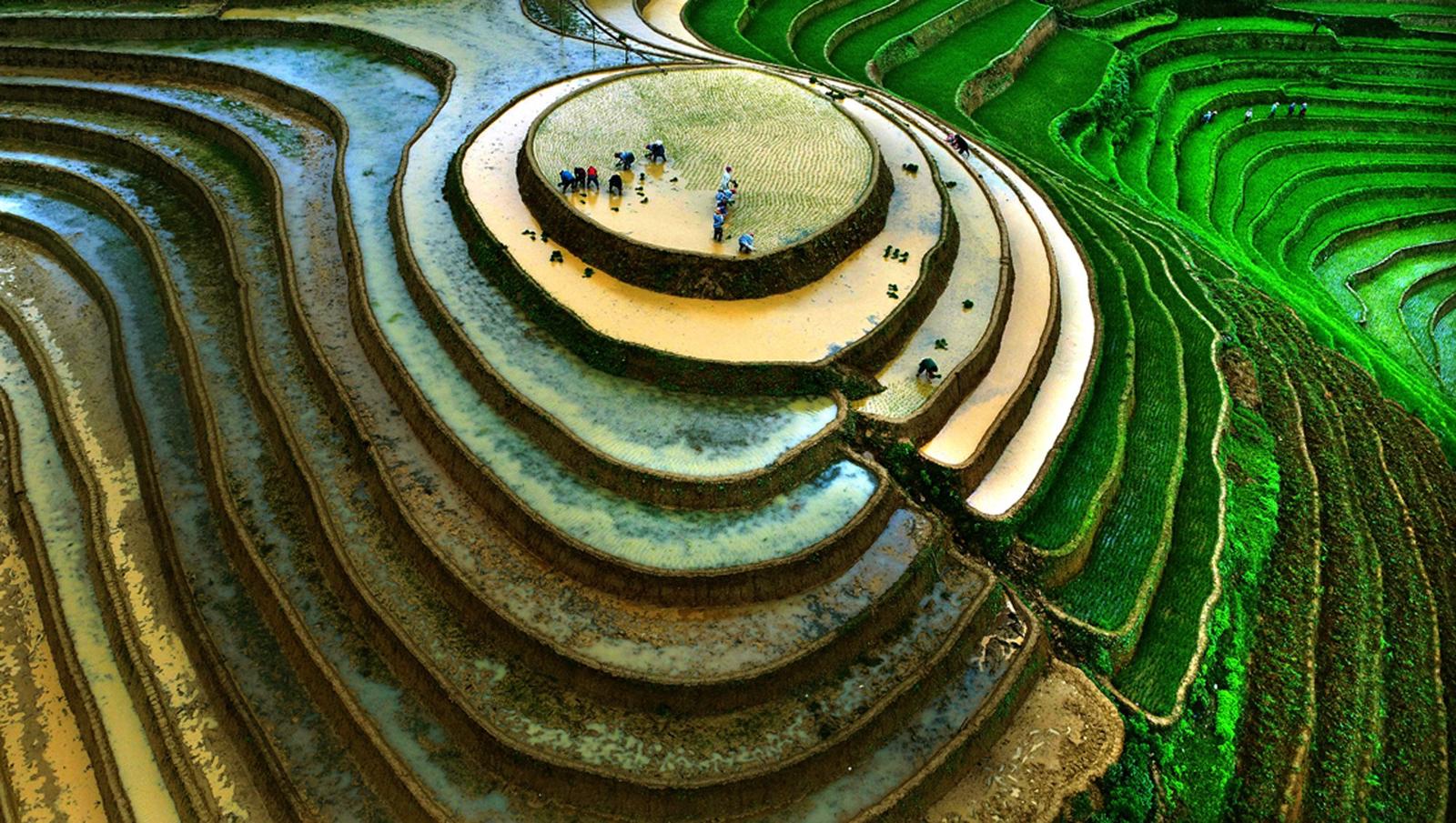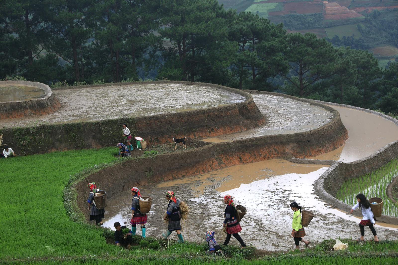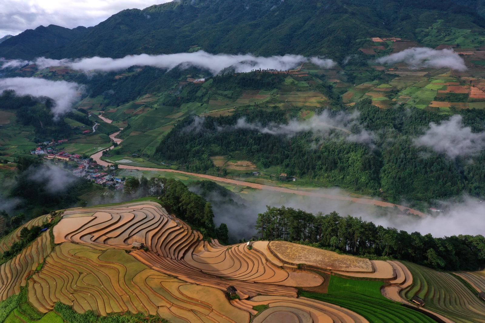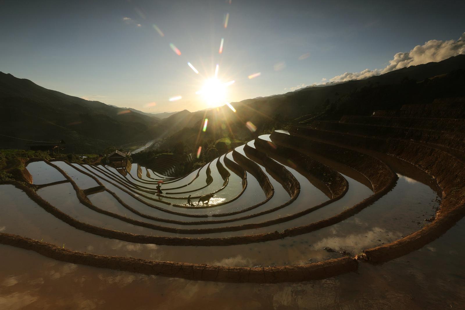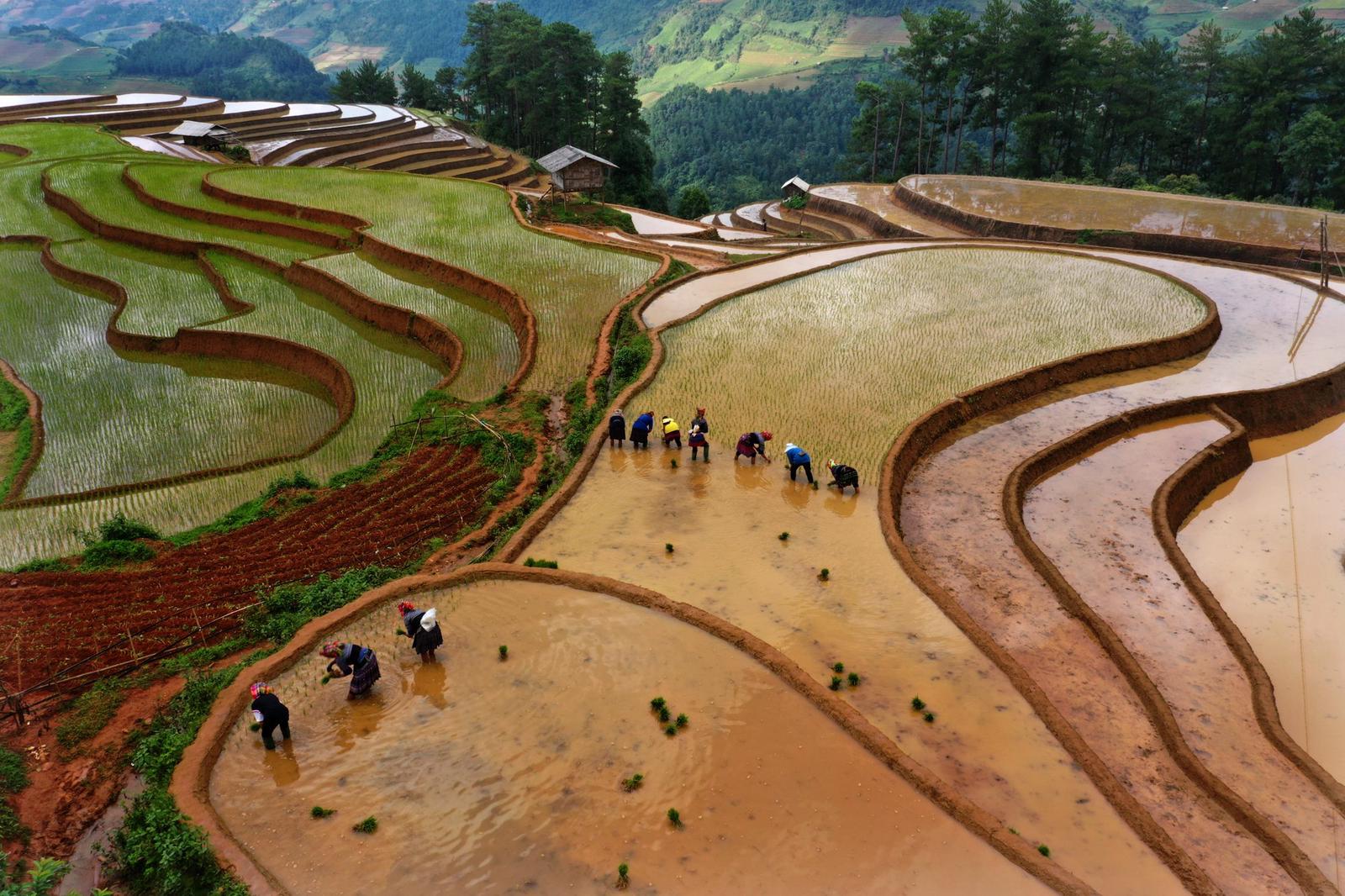 Những thửa ruộng mới cấy xanh rì, đan xen cùng luống đất nâu lóng lánh nước. Ruộng bậc thang là sự kết hợp hoàn hảo giữa vẻ hùng vĩ của núi rừng cùng vẻ đẹp của lao động sáng tạo, trải qua bao đời, bao thế hệ.