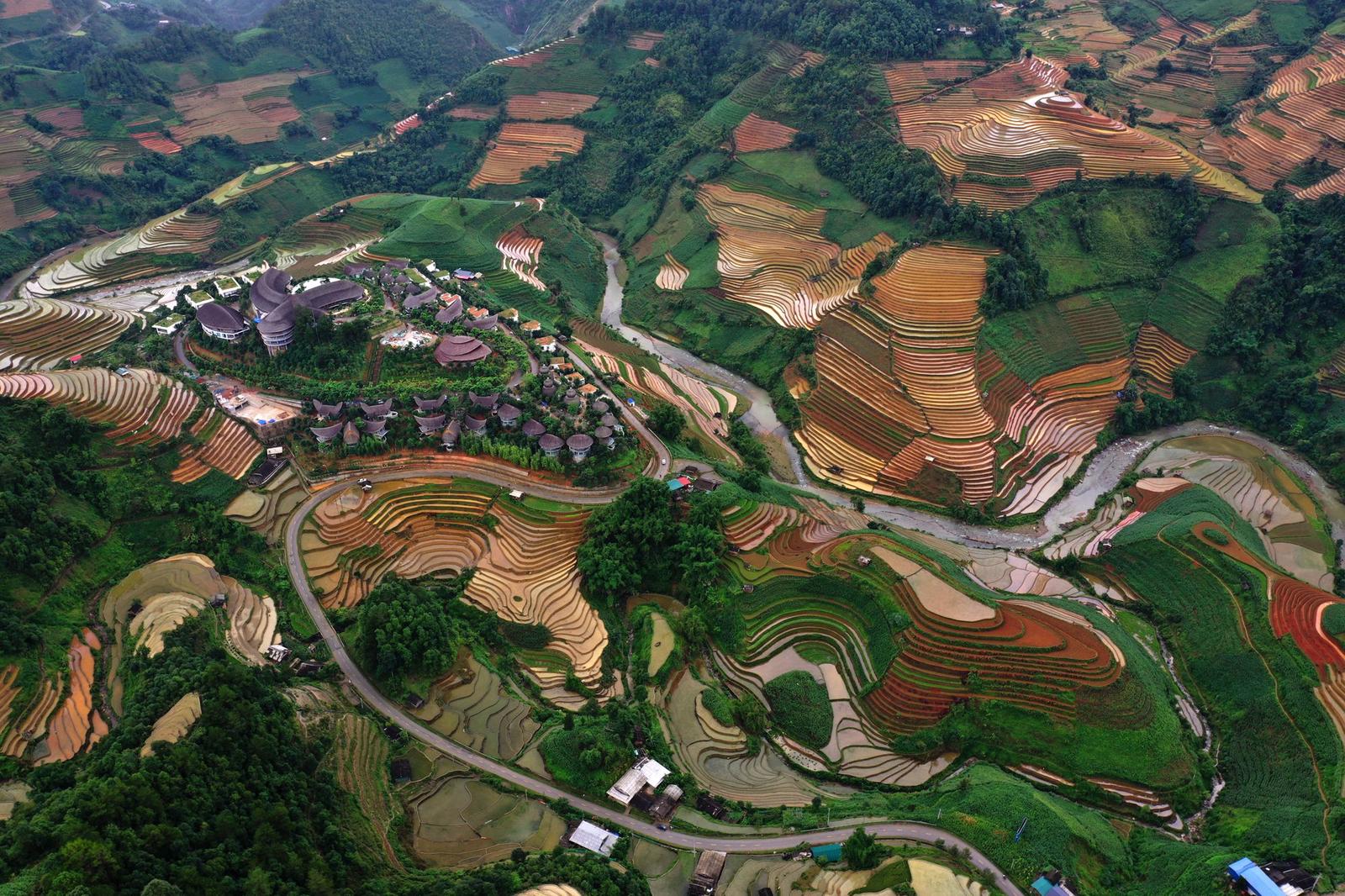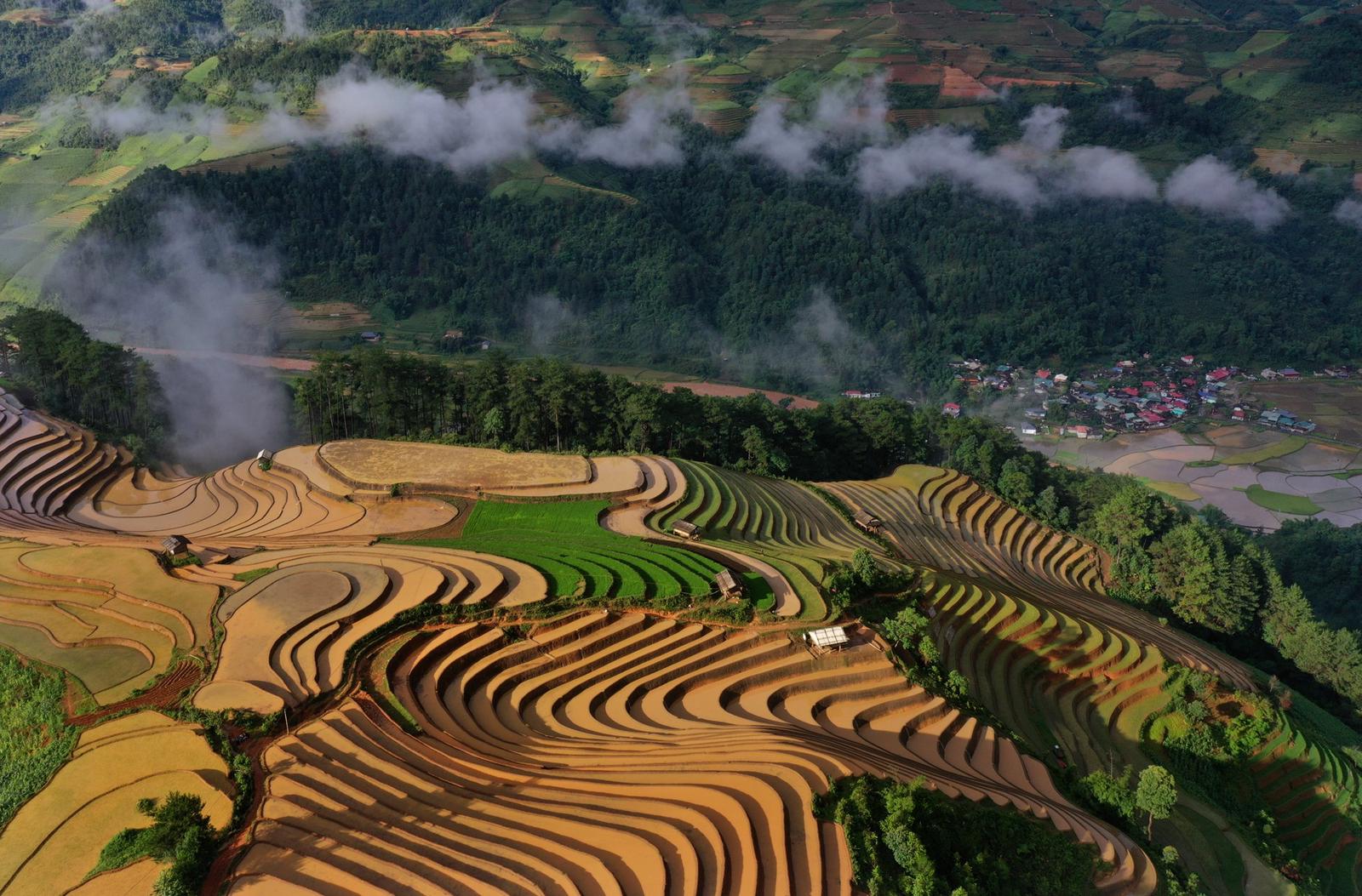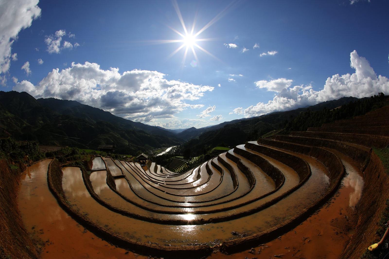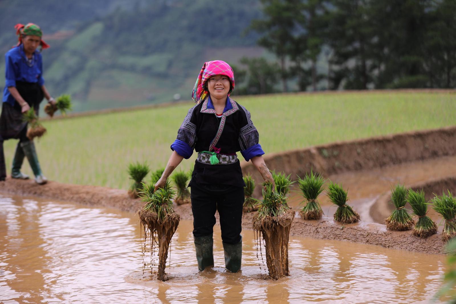 Những thửa ruộng mới cấy xanh rì, đan xen cùng luống đất nâu lóng lánh nước. Ruộng bậc thang là sự kết hợp hoàn hảo giữa vẻ hùng vĩ của núi rừng cùng vẻ đẹp của lao động sáng tạo, trải qua bao đời, bao thế hệ.