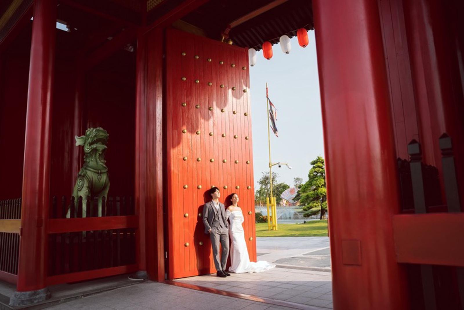 Cặp đôi này quyết định chọn vườn Nhật Vinhomes Smart City để lưu lại những khoảnh khắc hạnh phúc. Bối cảnh đầu tiên được chọn là cổng chào gỗ lớn với gam màu đỏ tượng trưng cho sự tương phùng trong văn hoá Á Đông. Cổng gỗ cũng chính là điểm nhấn ấn tượng của vườn Nhật Bản tại Vinhomes Smart City với ý nghĩa may mắn, thành công.