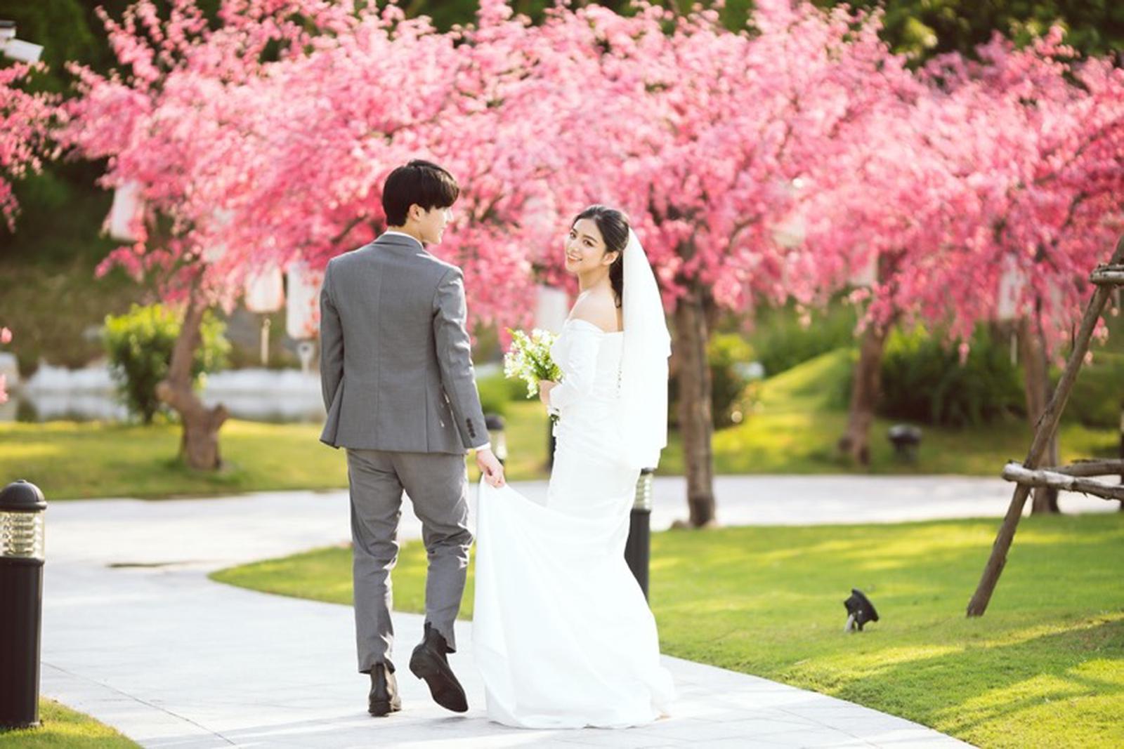 Bức hình cô dâu chú rể dạo bước trên Đại lộ hoa Anh đào nhận được nhiều lời khen từ người xem. Tại vườn Nhật Vinhomes Smart City, những cây hoa anh đào khoe sắc rực rỡ được tạo nên từ bàn tay của những nghệ nhân hoa lụa lành nghề nhất, lấy cảm hứng từ con đường nổi tiếng Zouheikyoku của Nhật Bản, là một trong những background ảnh cưới được các đôi uyên ương yêu thích nhất.
