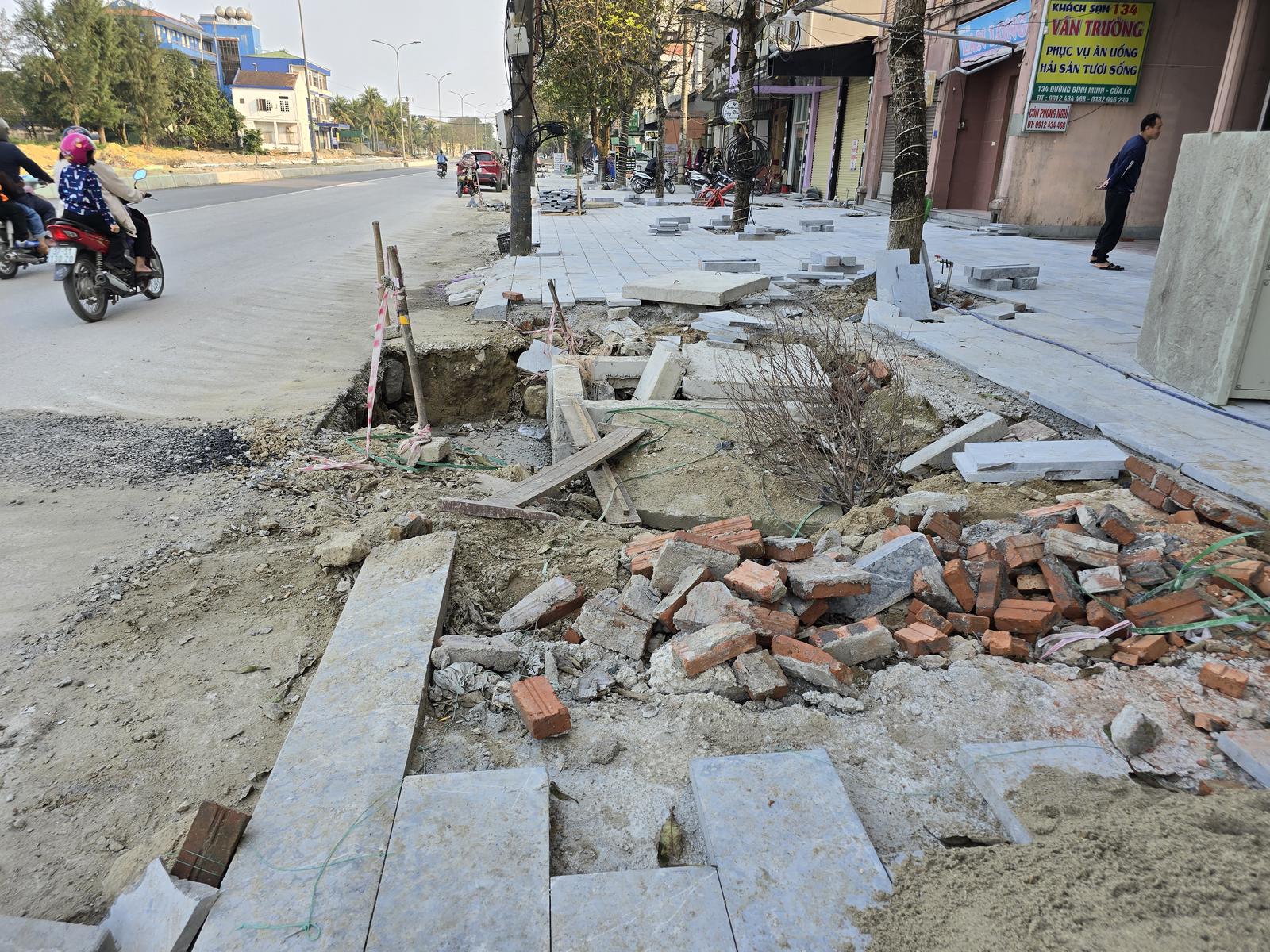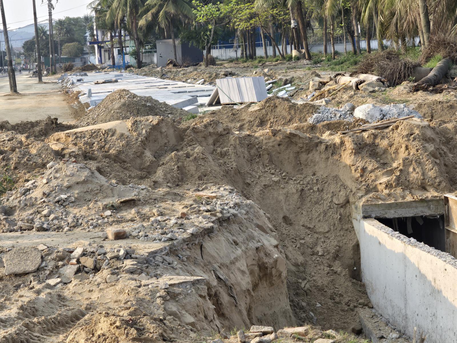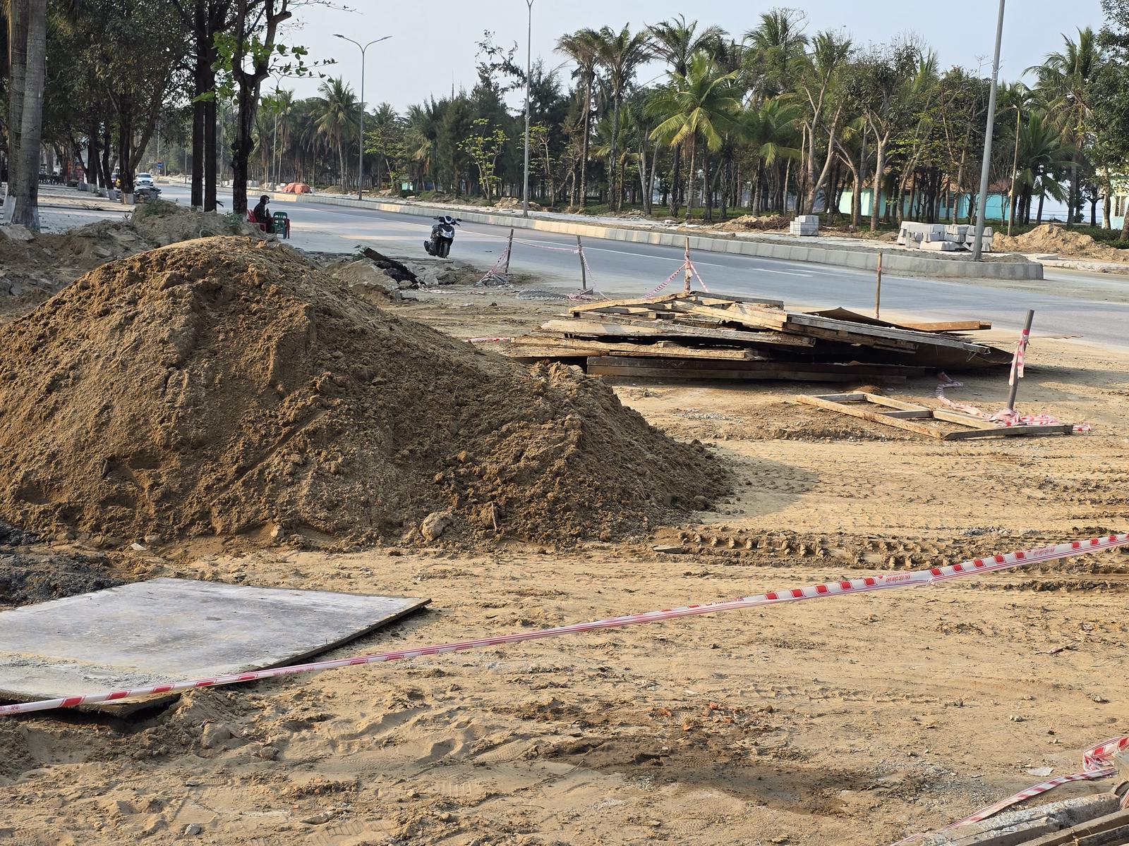 Phía đường mặt biển, mặc dù đơn vị thi công đã có cảnh báo, chắn đường để thi công, tuy nhiên, phía đường đối diện lại diễn ra cảnh nhếch nhác, nhiều điểm không có biển cảnh báo, thậm chí bị đào bới tứ tung. Đất, đá, gạch đổ khắp nơi; nhiều điểm hố ga, rãnh thoát nước đang được thi công đều không có biển cảnh báo, rất nguy hiểm cho người đi đường.