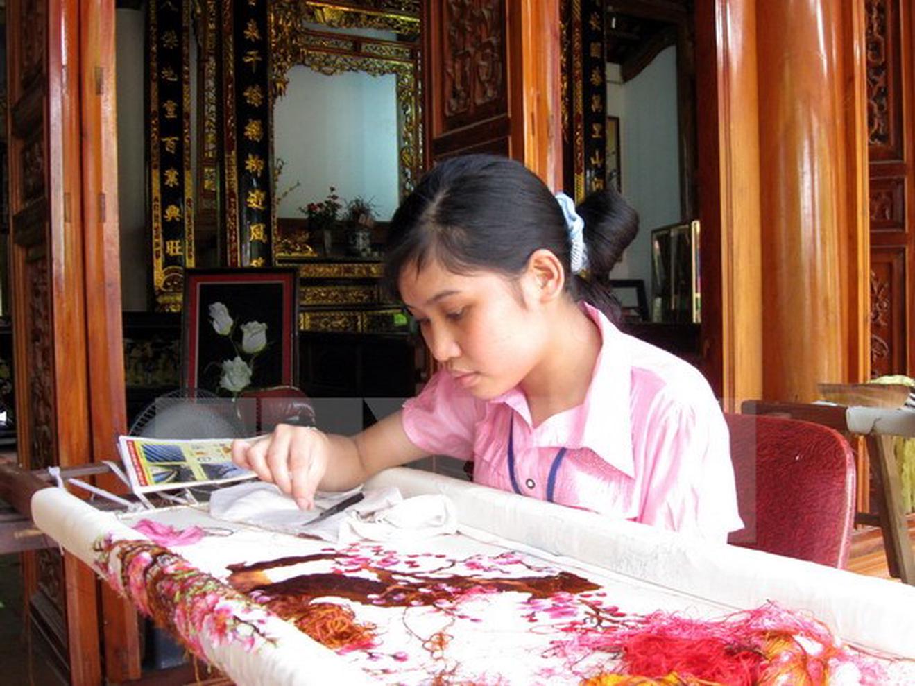 Sản phẩm thêu tay được làm thủ công trong khu vực làng nghề của Thiên Đường Bảo Sơn. (Ảnh : Hoàng Lâm/TTXVN)
