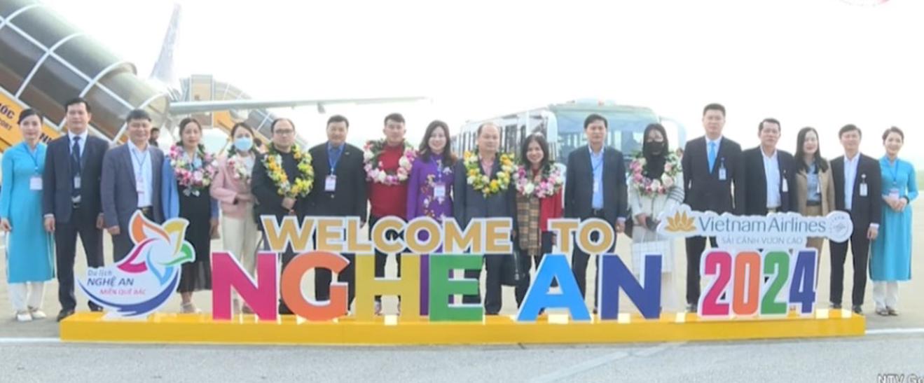 Lãnh đạo Sở Du lịch và sở, ngành, Hiệp hội Du lịch đón du khách và chuyến bay đầu tiên đến Nghệ An năm 2024 vào ngày 1/1/2024. Ảnh: Đức Anh