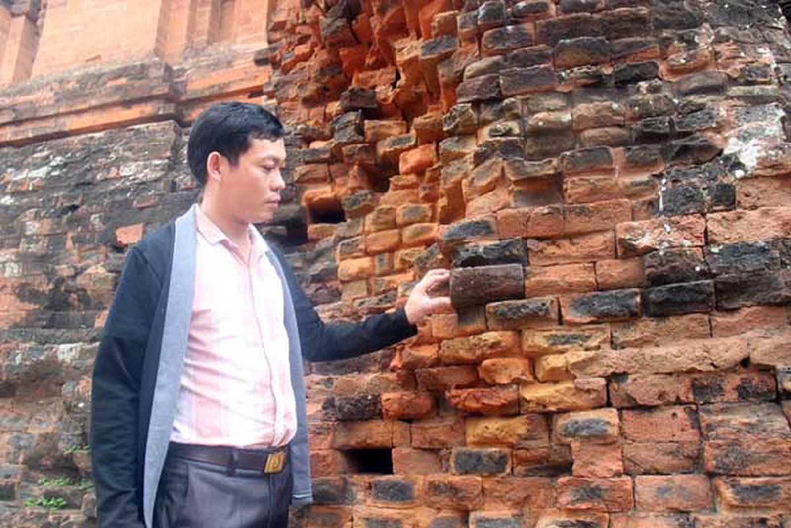 Tường gạch Tháp Nhạn đang bị thời gian bào mòn, cần được bảo vệ. Ảnh: XH