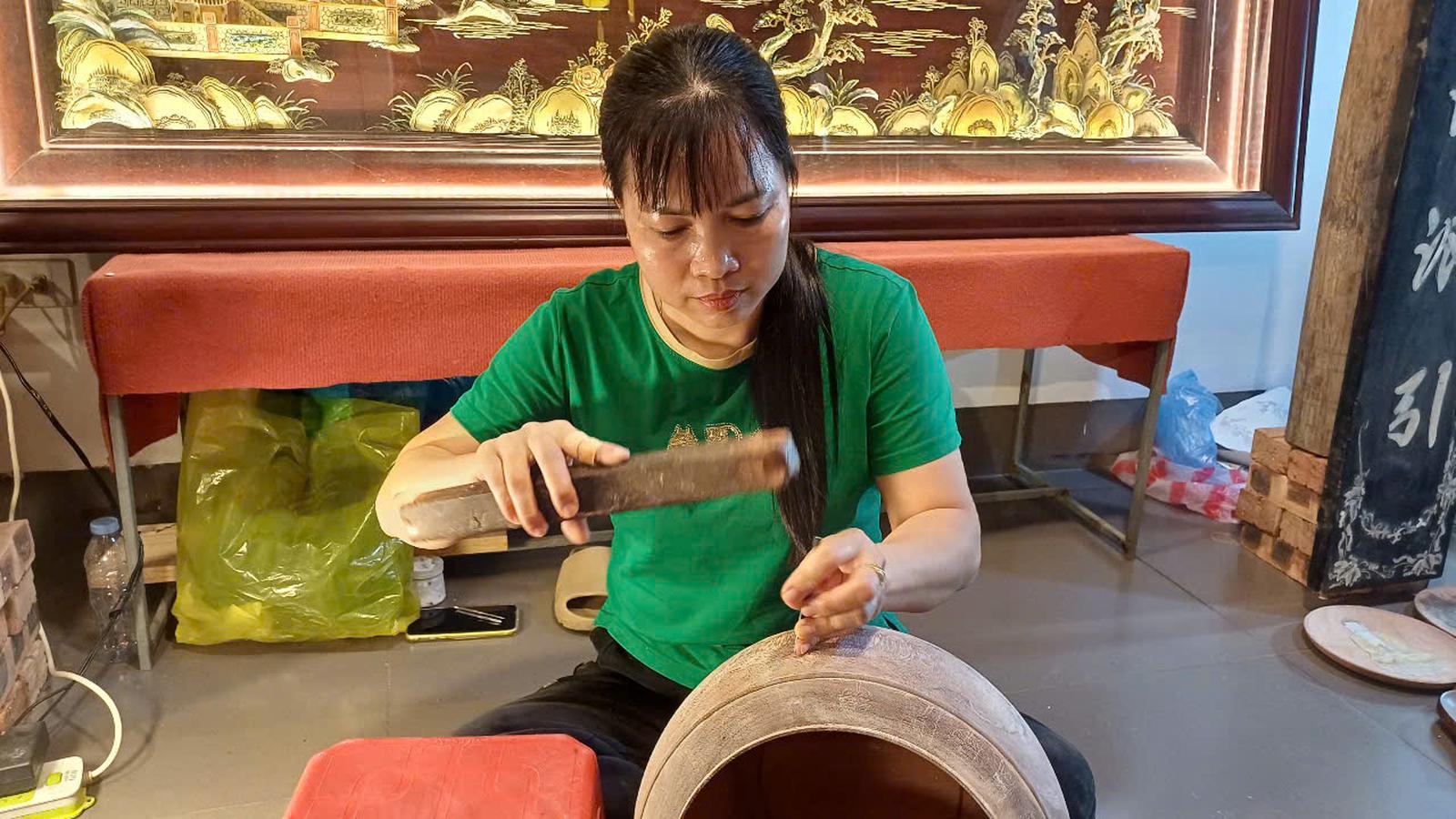 Trình diễn làm sản phẩm khảm trai của thợ thủ công xã Chuyên Mỹ, huyện Phú Xuyên, Hà Nội tại triển lãm. Ảnh: Tuấn Sơn