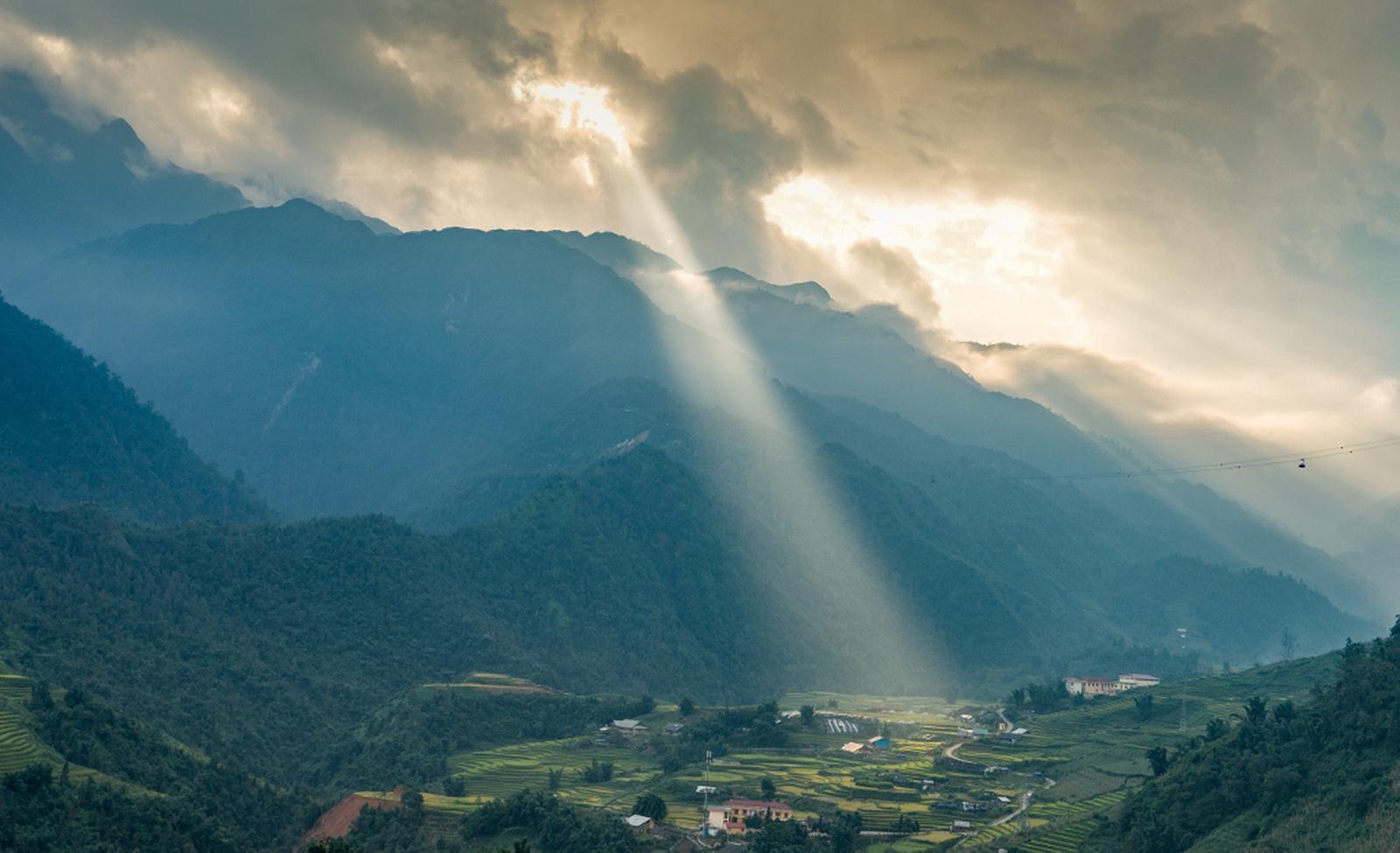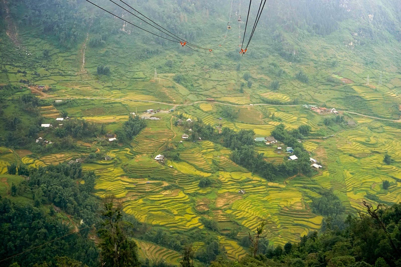 Ngồi trên cabin cáp treo Fansipan, du khách sẽ được “bay” trên thung lũng, tận mắt chiêm ngưỡng từng đường cong uốn lượn như dải lụa và những nếp nhà nhỏ xinh thanh bình men theo sườn dốc.