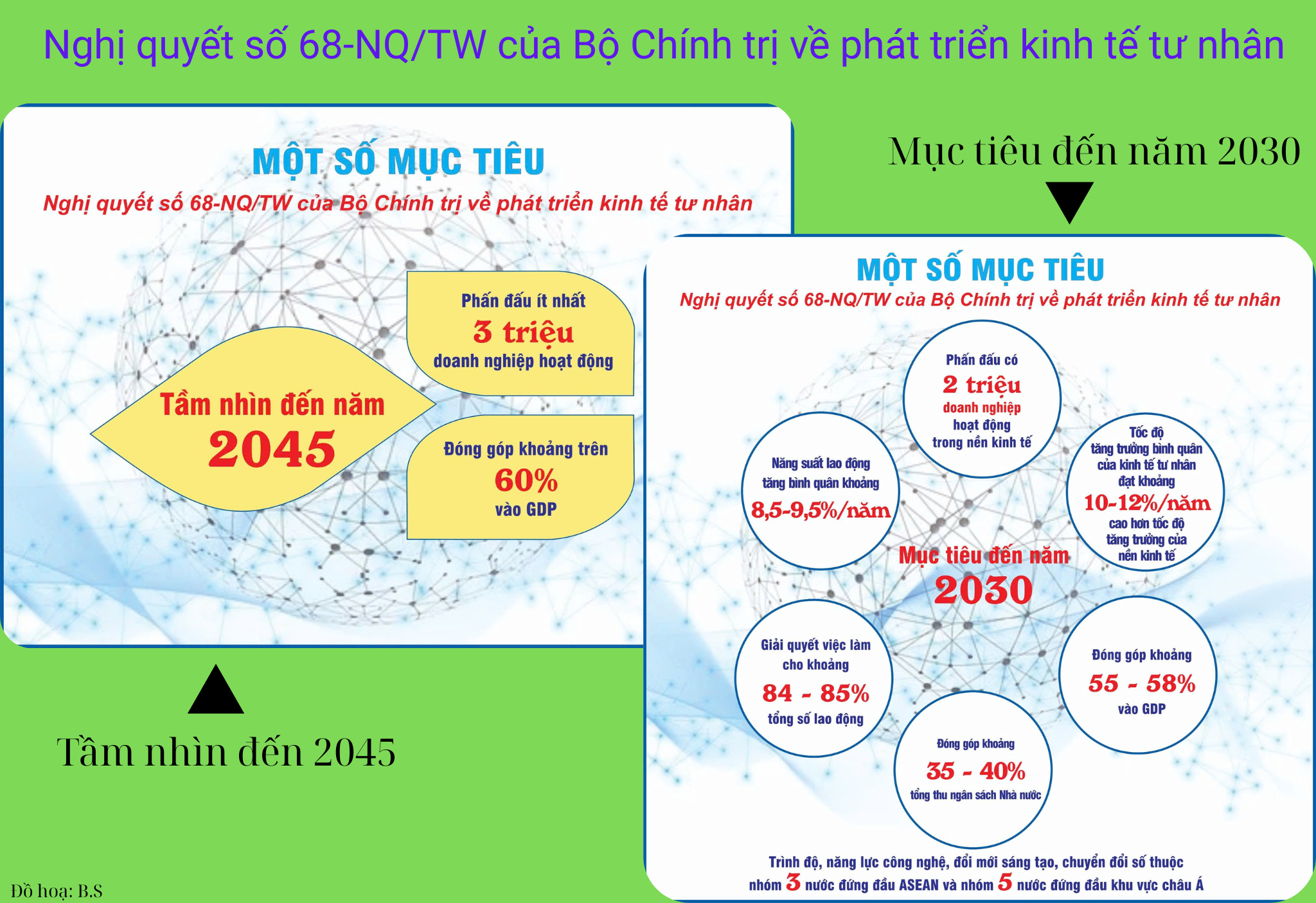 Mục tiêu của Nghị quyết 68 rất rõ ràng, đến năm 2030, kinh tế tư nhân là một động lực quan trọng nhất của nền kinh tế quốc gia; là lực lượng tiên phong trong phát triển khoa học công nghệ, đổi mới sáng tạo và chuyển đổi số. Phấn đấu có 2 triệu doanh nghiệp hoạt động trong nền kinh tế, 20 doanh nghiệp hoạt động/nghìn dân. Có ít nhất 20 doanh nghiệp lớn tham gia chuỗi giá trị toàn cầu.