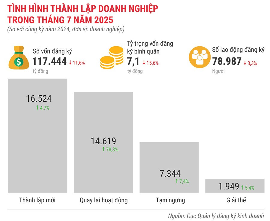 Tháng 7/2025, cả nước có thêm hơn 16,5 ngàn doanh nghiệp đăng ký, đưa tổng số doanh nghiệp thành lập 7 tháng đầu năm lên 107,7 ngàn, tăng 10,6%; số vốn tăng thêm của doanh nghiệp đang hoạt động đạt hơn 2,4 triệu tỷ đồng, tăng hơn 186% so với cùng kỳ năm 2024.