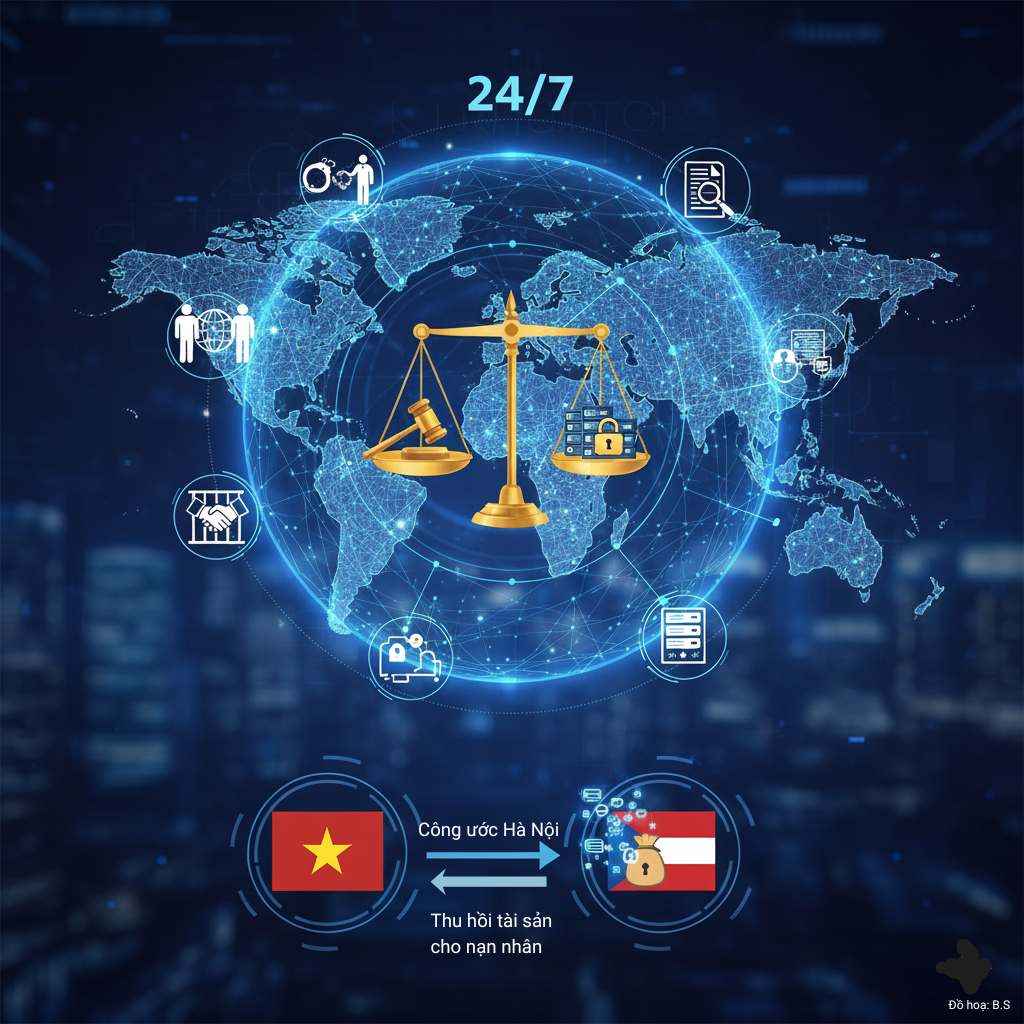 Công ước tạo ra một khuôn khổ pháp lý quốc tế rõ ràng, mang tính ràng buộc cho các hoạt động hợp tác, từ dẫn độ, chuyển giao người bị kết án tù, đến tương trợ tư pháp trong việc tiếp cận, thu thập và chặn thu dữ liệu. Mạng lưới 24/7 chính là công cụ để biến các quy định pháp lý này thành hành động thực tiễn. Khi một doanh nghiệp hoặc người dân Việt Nam bị lừa đảo bởi một tổ chức tội phạm đặt máy chủ ở nước ngoài, cơ quan chức năng Việt Nam có thể, thông qua Công ước, yêu cầu quốc gia thành viên kia hỗ trợ phong tỏa dữ liệu, thu thập bằng chứng và phối hợp điều tra.