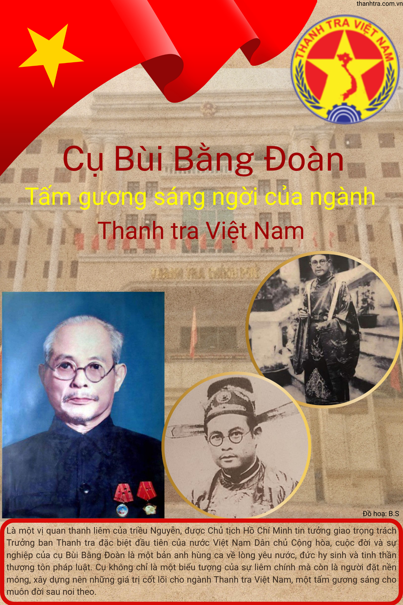 Cuộc đời của cụ Bùi Bằng Đoàn là tấm gương sáng ngời về một nhân cách lớn, một trí thức yêu nước chân chính, đã dành trọn đời mình phụng sự Tổ quốc, phục vụ nhân dân. Đối với ngành Thanh tra Việt Nam, cụ không chỉ là vị Trưởng ban đầu tiên, mà còn là người đặt nền móng cho những giá trị cốt lõi: Công Bằng - Chính Trực - Liêm Minh.