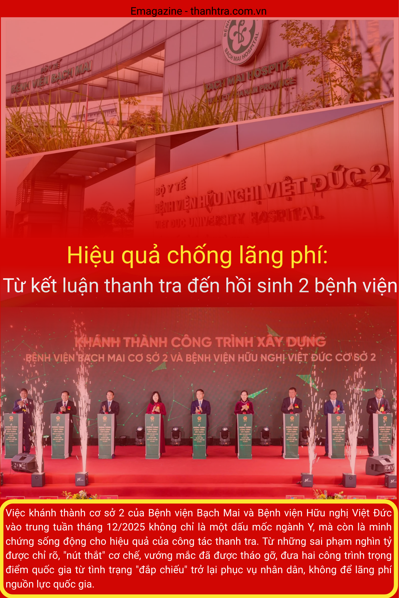 Nhờ sự nỗ lực của Bộ Y tế, nhất là vai trò người đứng đầu, cùng với sự hỗ trợ của Chính phủ và các Bộ ngành, của Thanh tra Chính phủ, vào ngày 19/12/2025, cả hai cơ sở đã chính thức khai trương và bắt đầu tiếp nhận người bệnh. Đây là một thắng lợi lớn, là minh chứng cho sự quyết tâm chính trị. Hiện tại, hai cơ sở này đang phát huy hiệu quả to lớn trong việc giúp giảm đáng kể tình trạng quá tải cho bệnh viện tuyến Trung ương và nâng cao chất lượng khám chữa bệnh.