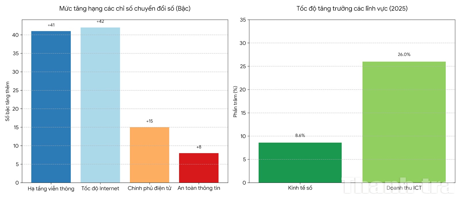 Sau 5 năm triển khai chuyển đổi số, đặc biệt là dấu ấn đậm nét của năm 2025, Việt Nam đã ghi nhận những bước nhảy vọt: Chỉ số hạ tầng viễn thông tăng 41 bậc, Chính phủ điện tử tăng 15 bậc, tốc độ internet tăng 42 bậc và an toàn thông tin đứng hạng 17 toàn cầu.