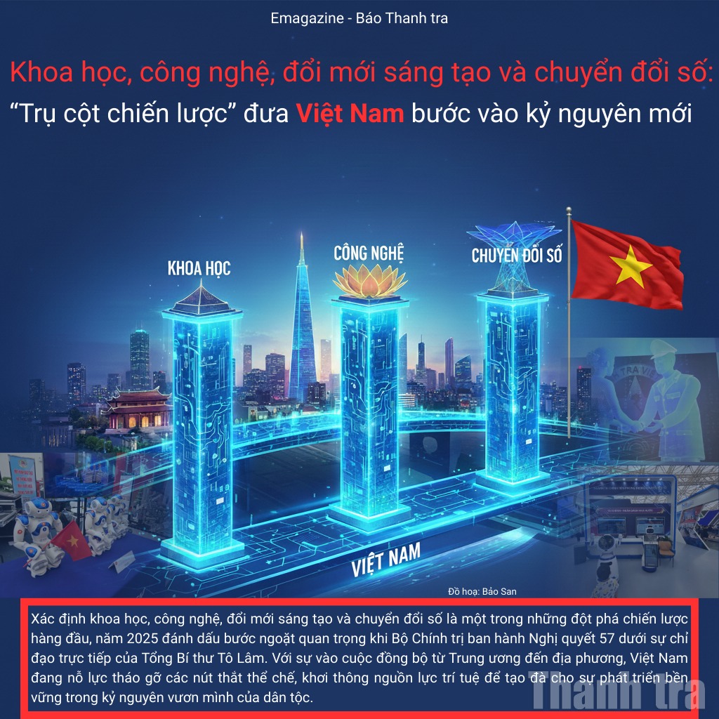 Cuối năm 2024, Nghị quyết số 57-NQ/TW ngày 22/12/2024 của Bộ Chính trị được ban hành đã đánh dấu một bước ngoặt quan trọng về chuyển đổi số ở Việt Nam. Với tầm nhìn chiến lược và sự chỉ đạo quyết liệt của Bộ Chính trị, trực tiếp là Tổng Bí thư Tô Lâm, Nghị quyết xác định khoa học, công nghệ, đổi mới sáng tạo và chuyển đổi số là đột phá hàng đầu, trở thành động lực then chốt, định hình phương thức quản trị quốc gia, phát triển kinh tế - xã hội và nâng cao năng lực cạnh tranh của đất nước trong giai đoạn mới.