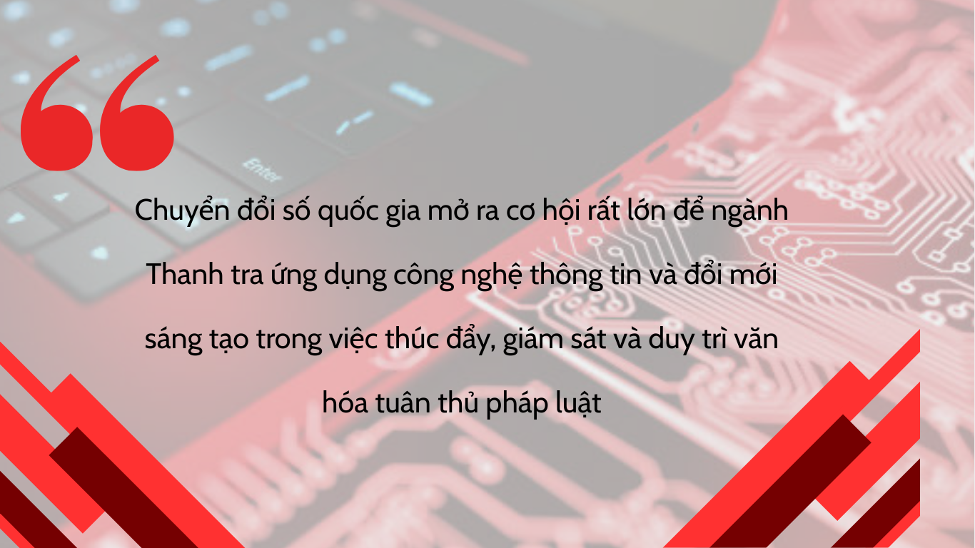 Và cuối cùng, ứng dụng mạnh mẽ công nghệ thông tin, chuyển đổi số vào các hoạt động cụ thể của ngành Thanh tra, nhất là tiến hành số hoá quy trình công tác thanh tra, tiếp công dân, xử lý đơn thư, giải quyết khiếu nại, tố cáo, phòng, chống tham nhũng, lãng phí, tiêu cực, thực hiện công khai, minh bạch dữ liệu, áp dụng hệ thống cảnh báo rủi ro pháp lý để hỗ trợ cán bộ, công chức thanh tra thực hiện đúng quy định trong quá trình thực hiện nhiệm vụ chính trị của ngành.