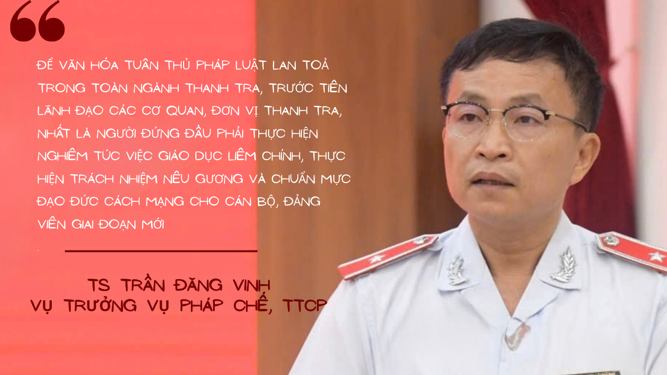 Theo TS Trần Đăng Vinh, để văn hóa tuân thủ pháp luật lan toả trong toàn ngành Thanh tra, trước tiên lãnh đạo các cơ quan, đơn vị thanh tra, nhất là người đứng đầu phải thực hiện nghiêm túc việc giáo dục liêm chính, thực hiện trách nhiệm nêu gương và chuẩn mực đạo đức cách mạng cho cán bộ, đảng viên giai đoạn mới theo tinh thần Quy định số 144-QĐ/TW ngày 9/5/2024 của Bộ Chính trị, trở thành hình mẫu về liêm chính, kỷ luật và tuân thủ pháp luật; lời nói và hành động nhất quán để tạo niềm tin và uy tín trong cơ quan, đơn vị và xây dựng hình ảnh với công chúng.