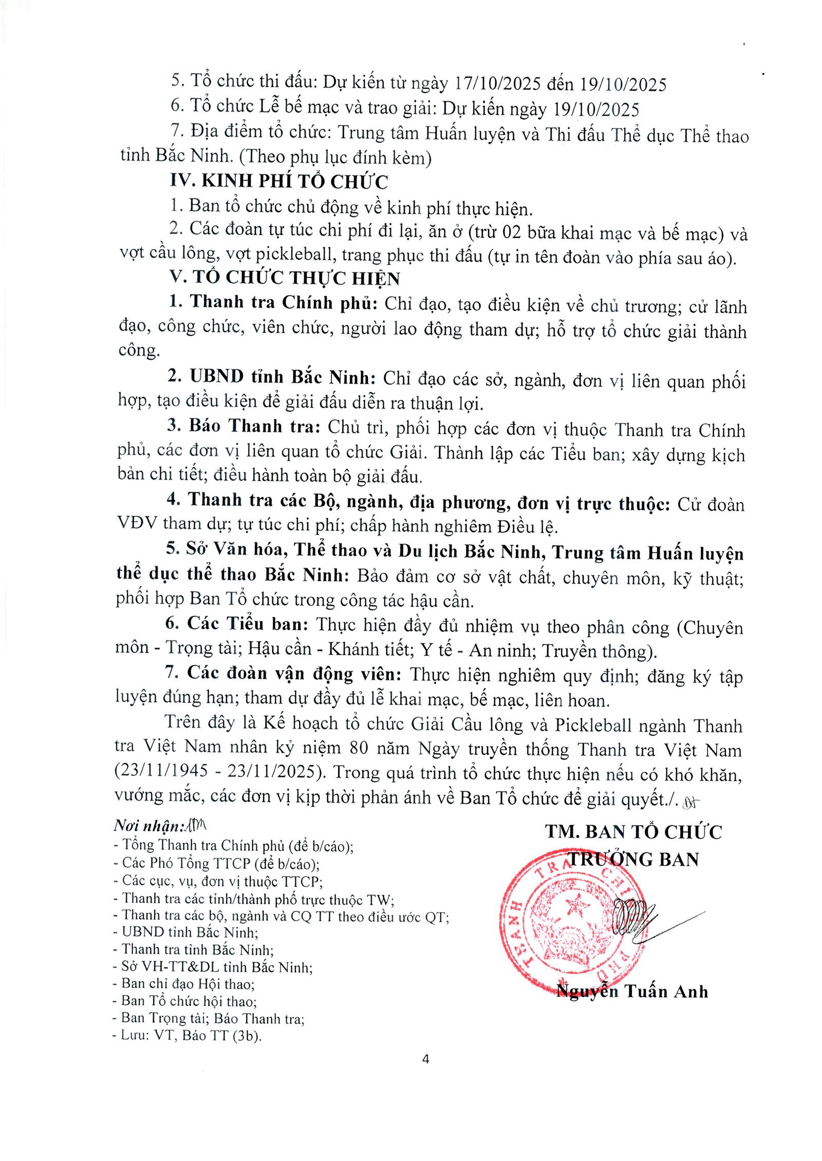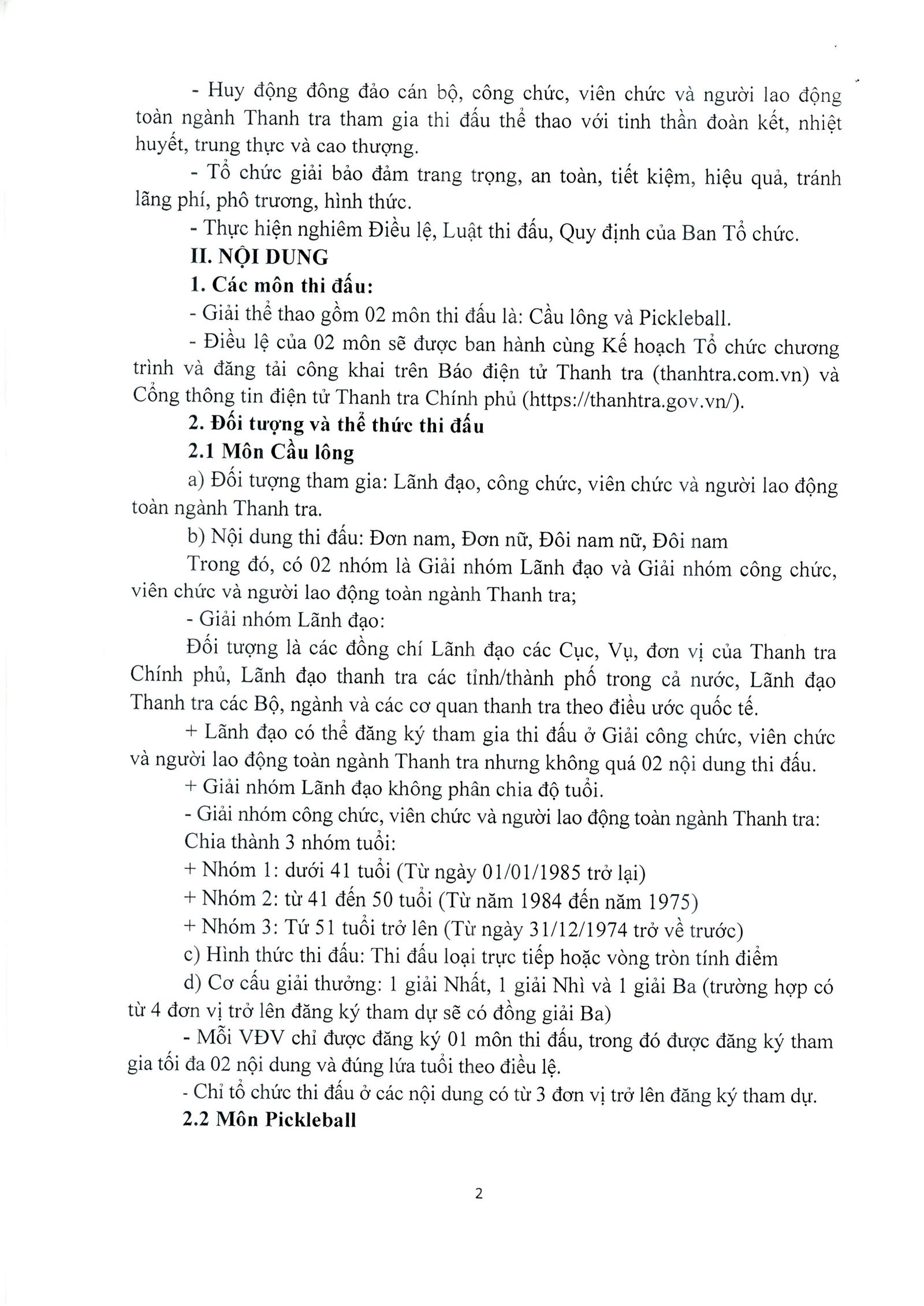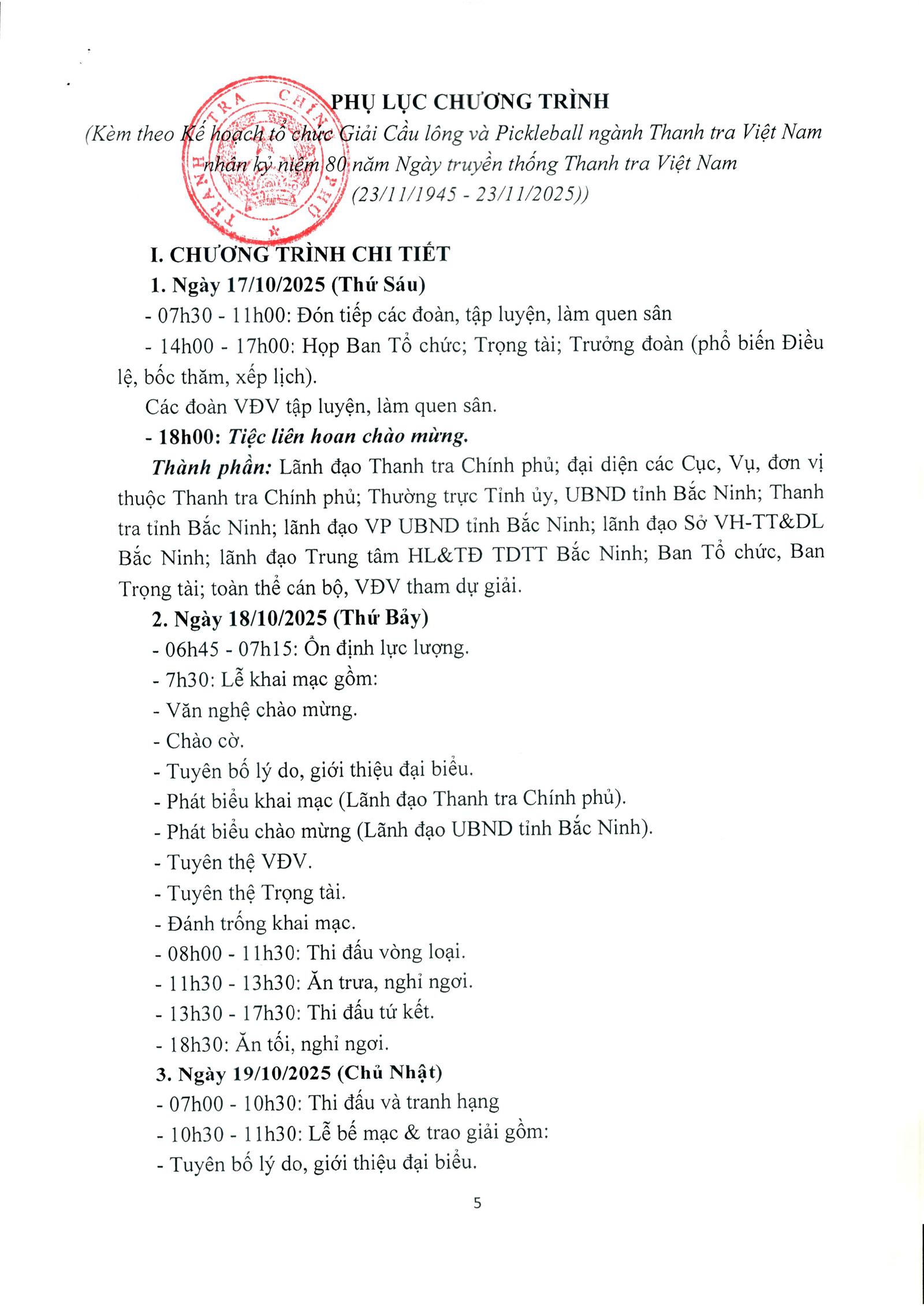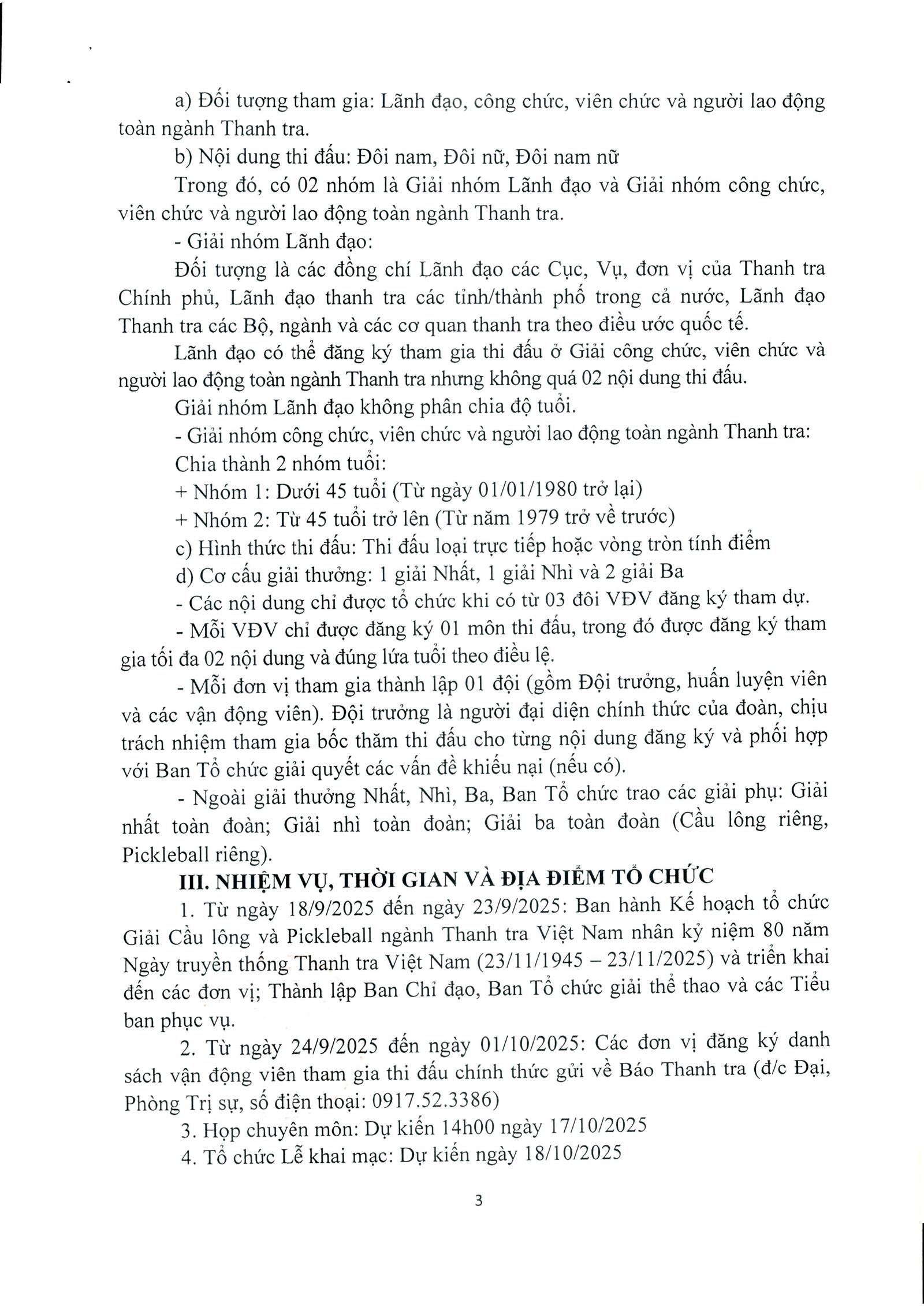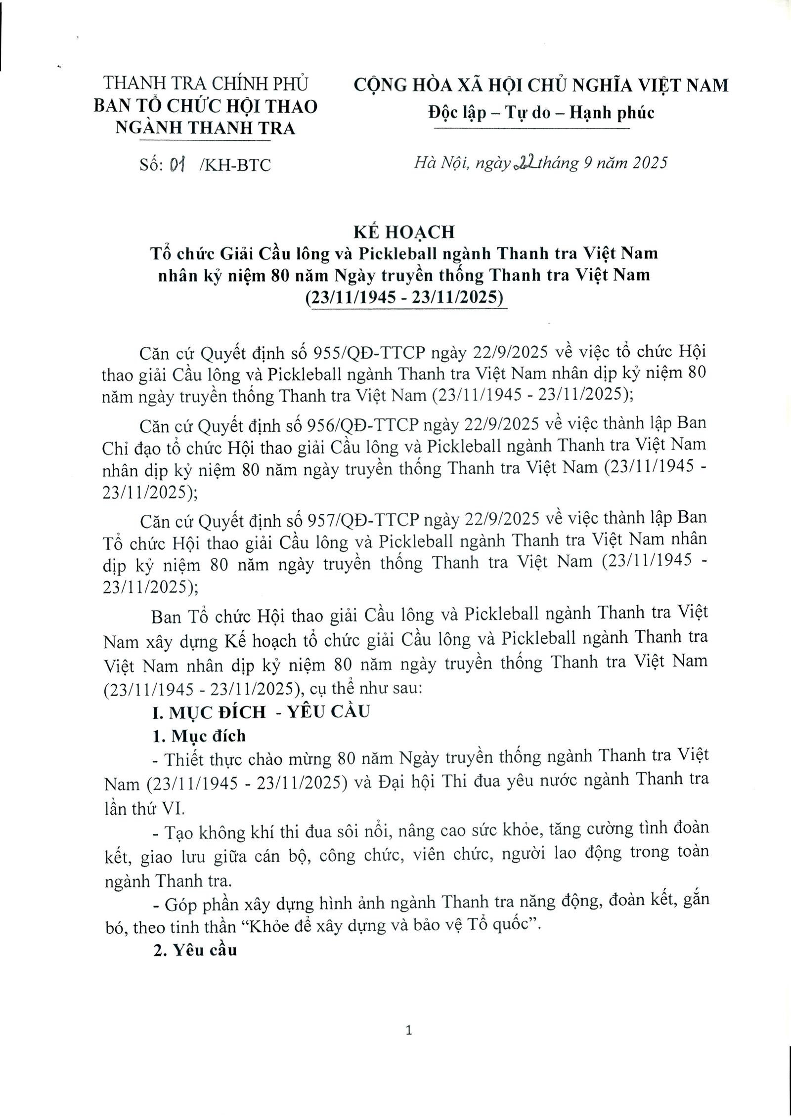 (Thanh tra) - Kế hoạch Tổ chức Giải Cầu lông và Pickleball ngành Thanh tra Việt Nam nhân kỷ niệm 80 năm Ngày truyền thống Thanh tra Việt Nam (23/11/1945 - 23/11/2025)