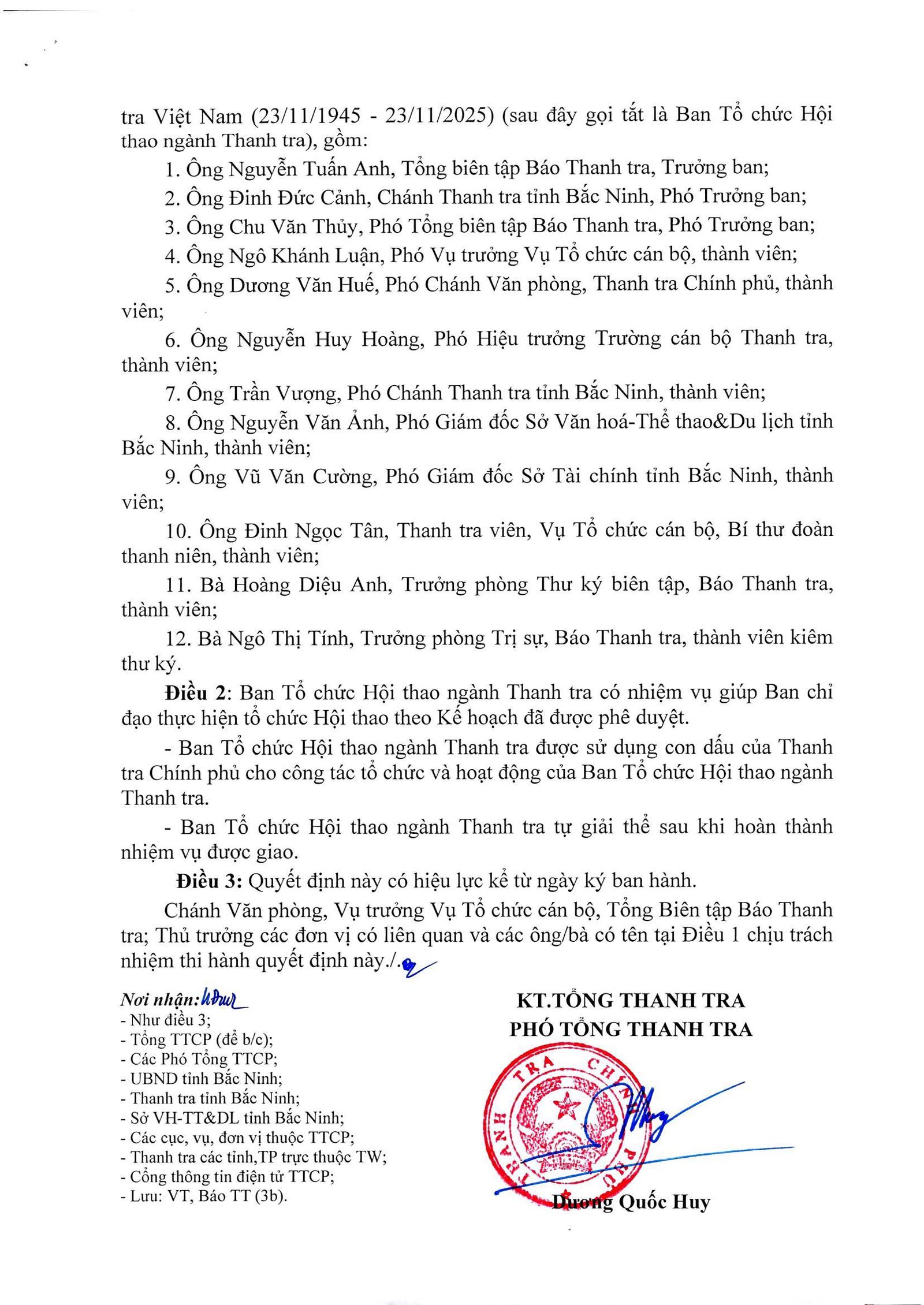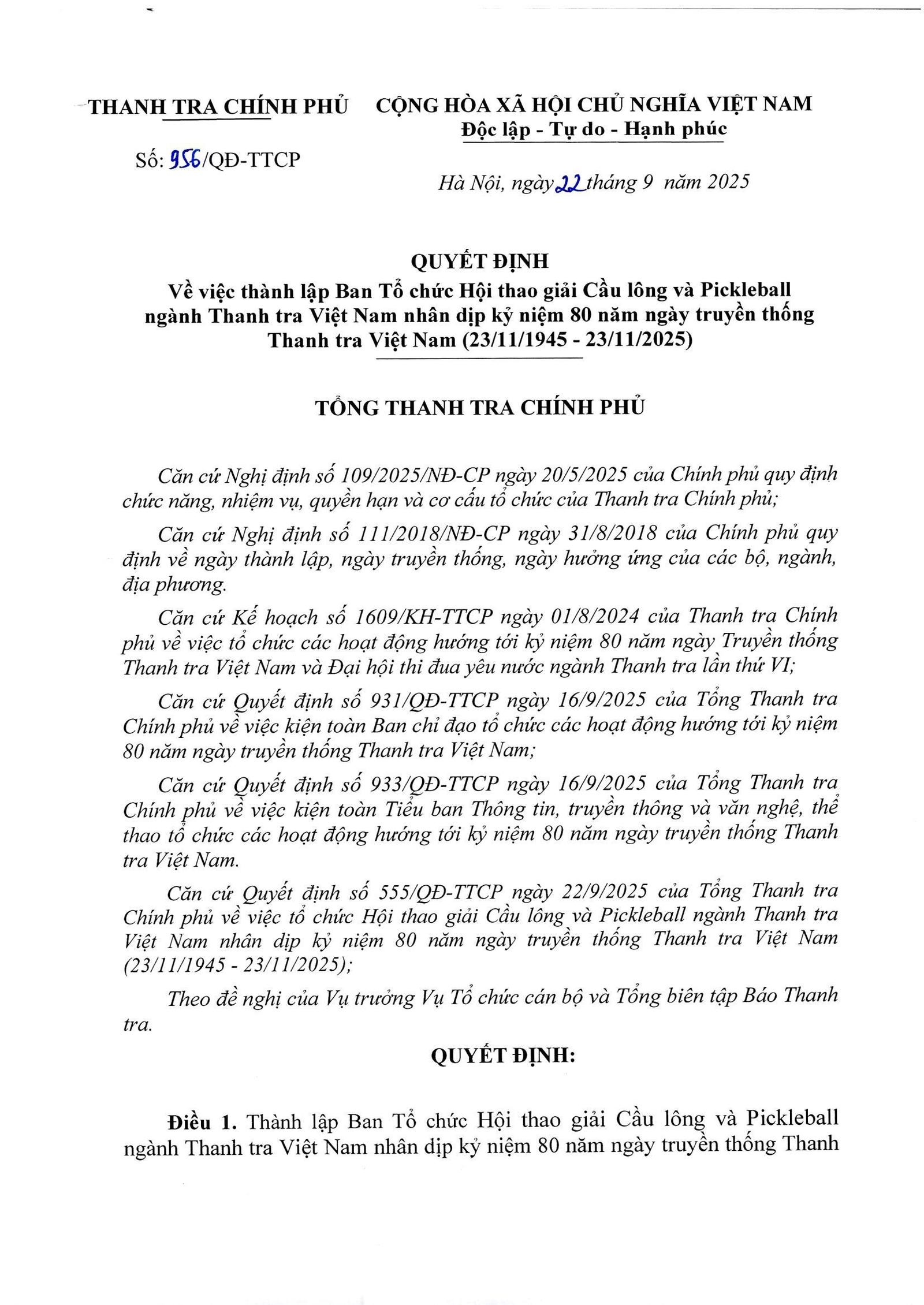(Thanh tra) - Quyết định về việc thành lập Ban Tổ chức Hội thao giải Cầu lông và Pickleba ngành Thanh tra Việt Nam nhân dịp kỷ niệm 80 năm ngày truyền thống Thanh tra Việt Nam (23/11/1945 - 23/11/2025)