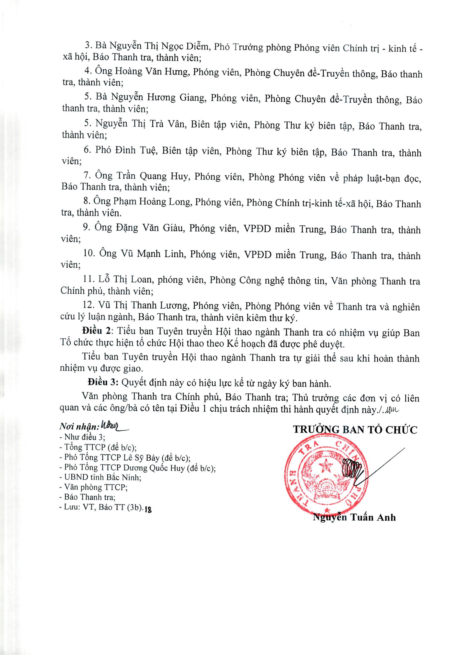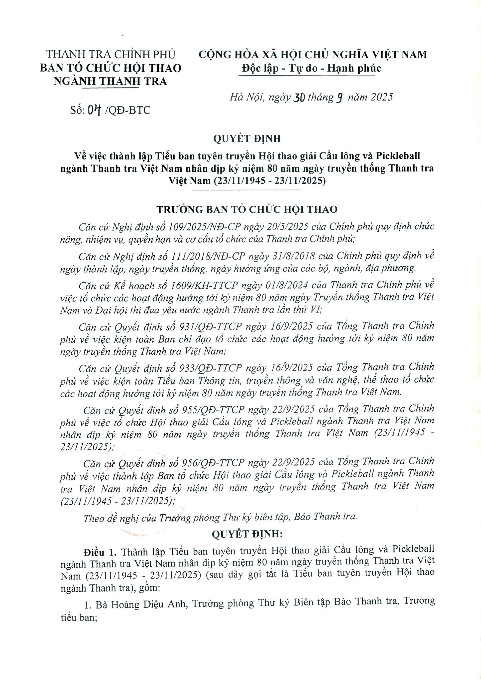 (Thanh tra) - Quyết định về việc thành lập Tiểu ban tuyên truyền Hội thao giải Cầu lông và Pickleball ngành Thanh tra Việt Nam nhân dịp kỷ niệm 80 năm ngày truyền thống Thanh tra Việt Nam (23/11/1945 - 23/11/2025)