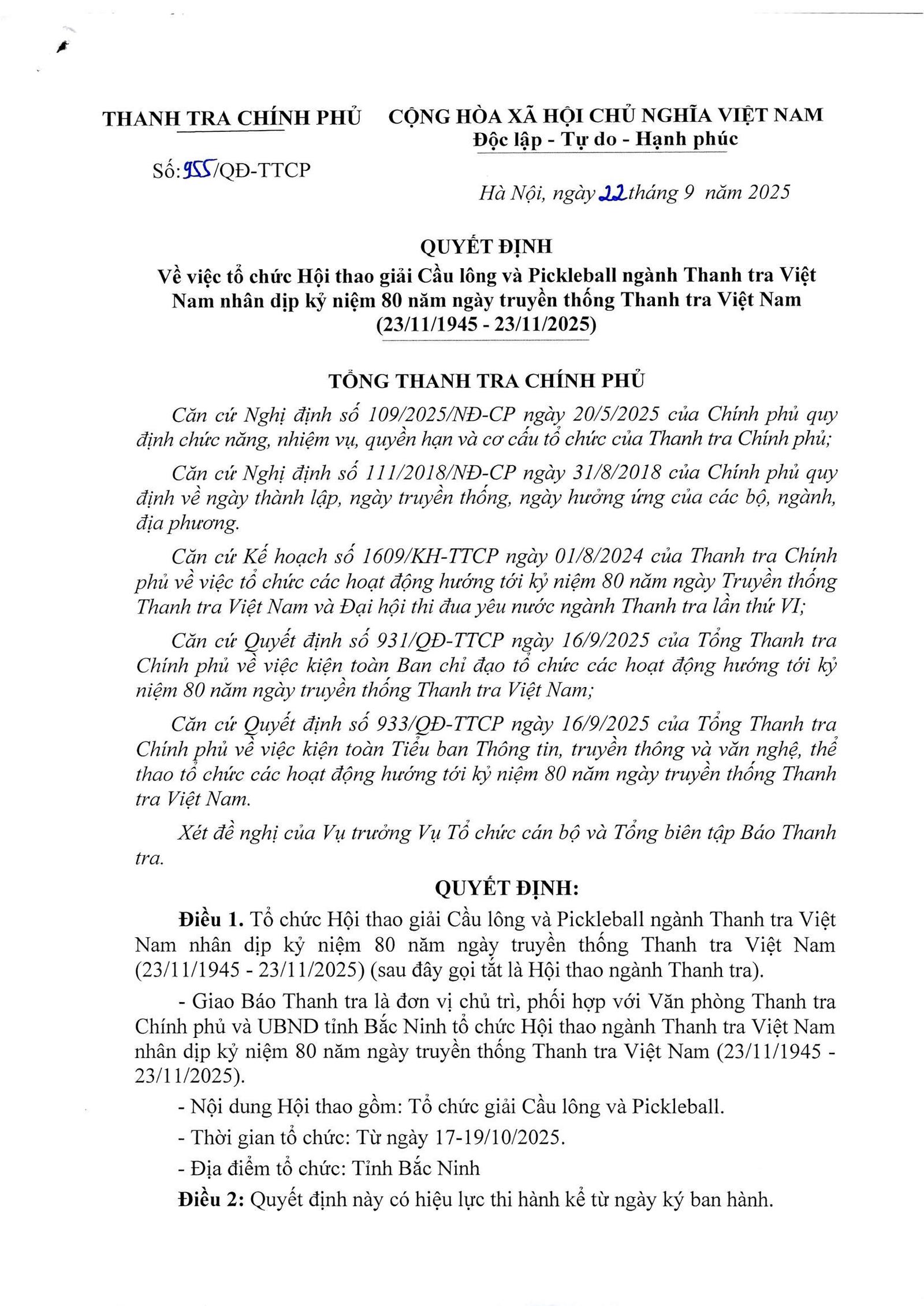 (Thanh tra) - Quyết định về việc tổ chức Hội thao giải Cầu lông và Pickleball ngành Thanh tra Việt Nam nhân dịp kỷ niệm 80 năm ngày truyền thống Thanh tra Việt Nam (23/11/1945 - 23/11/2025)