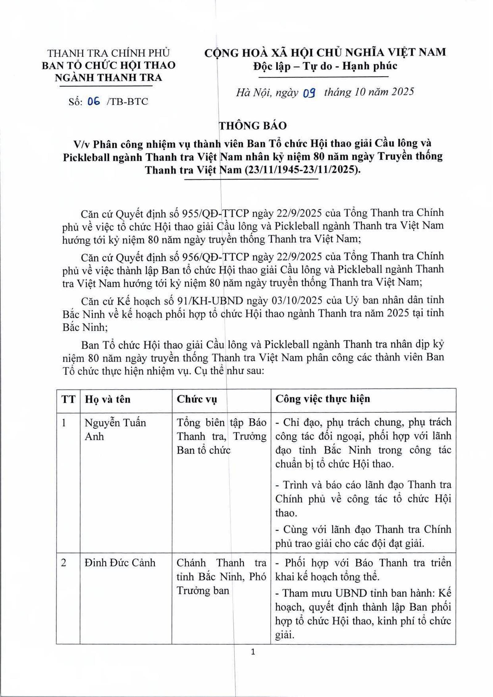 (Thanh tra) - Thông báo về việc phân công nhiệm vụ thành viên Ban Tổ chức Hội thao giải Cầu lông và Pickleball ngành Thanh tra Việt Nam nhân kỷ niệm 80 năm ngày Truyền thống Thanh tra Việt Nam (23/11/1945 - 23/11/2025)