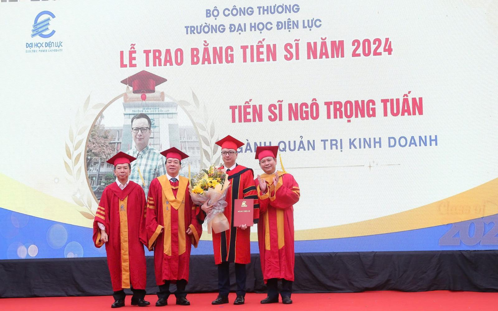 PGS.TS Vũ Đình Ngọ - Chủ tịch Hội đồng trường (thứ 2 từ trái sang) và PGS.TS Đinh Văn Châu - Quyền Hiệu trưởng trường Đại học Điện lực (bên phải) cùng đại biểu trao bằng tốt nghiệp và chúc mừng tân Tiến sĩ. Ảnh: ĐHĐL
