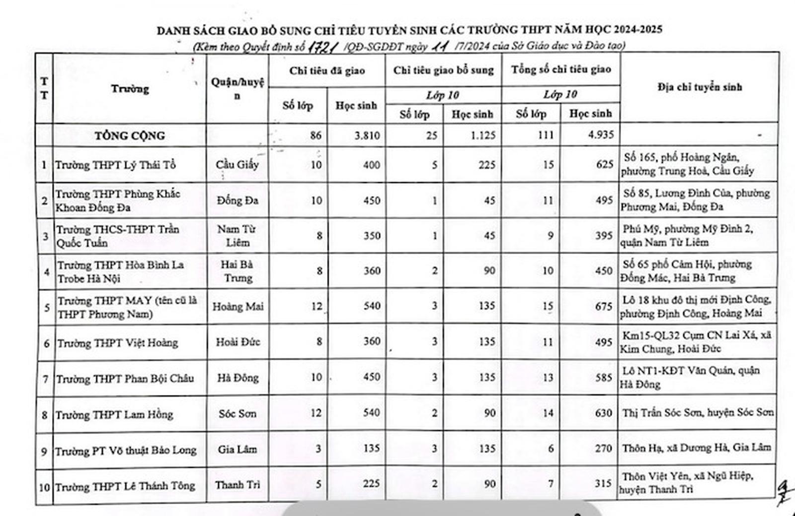 Việc Sở Giáo dục và Đào tạo Hà Nội giao bổ sung hơn 1.500 chỉ tiêu tuyển sinh lớp 10 được căn cứ vào điều kiện cơ sở vật chất, đội ngũ giáo viên của các nhà trường, điển hình: Trường THPT Lý Thái Tổ (quận Cầu Giấy), Trường Phổ thông Võ thuật Bảo Long (huyện Gia Lâm), Trường THCS - THPT Trần Quốc Tuấn (quận Nam Từ Liêm)...