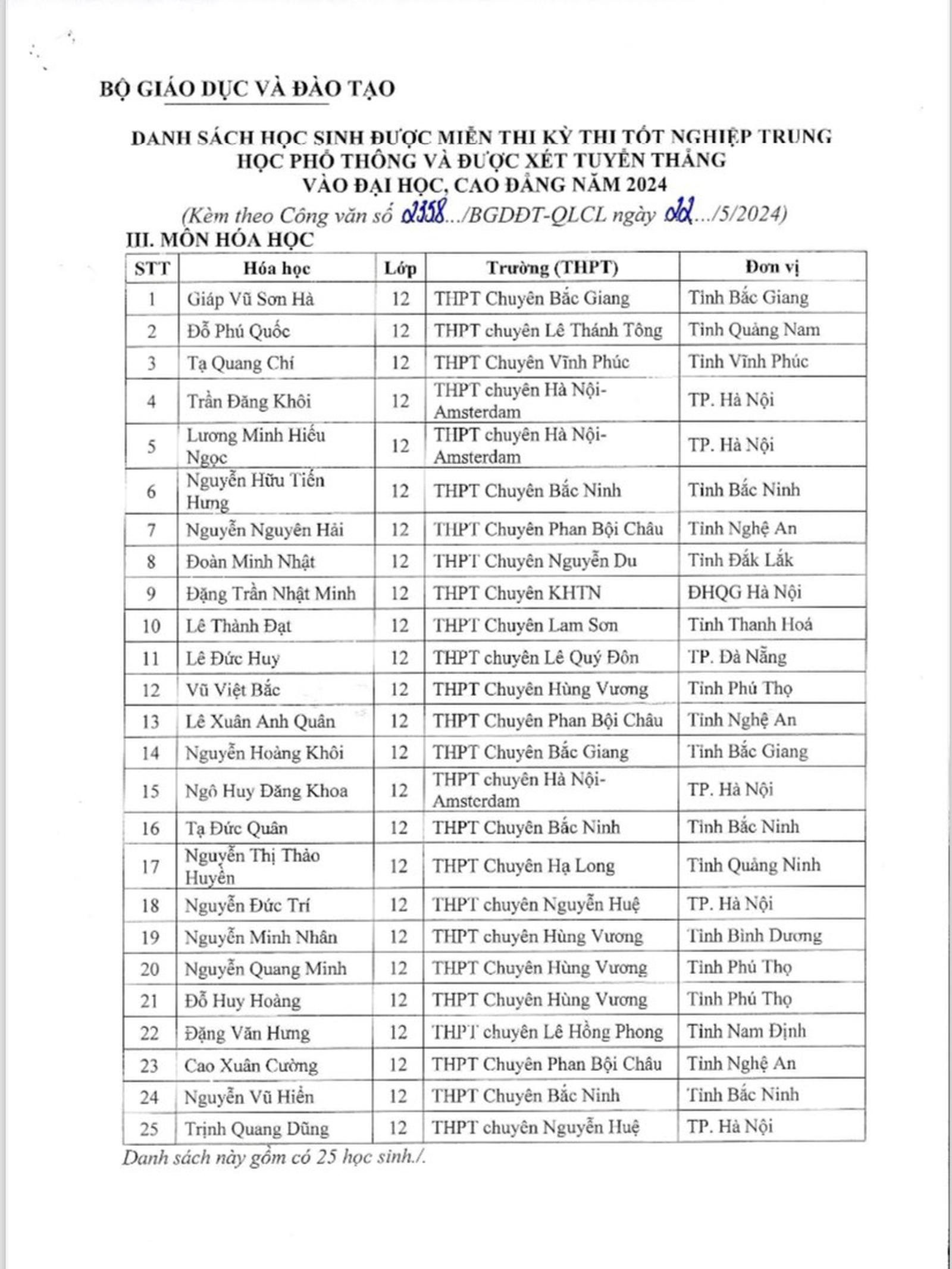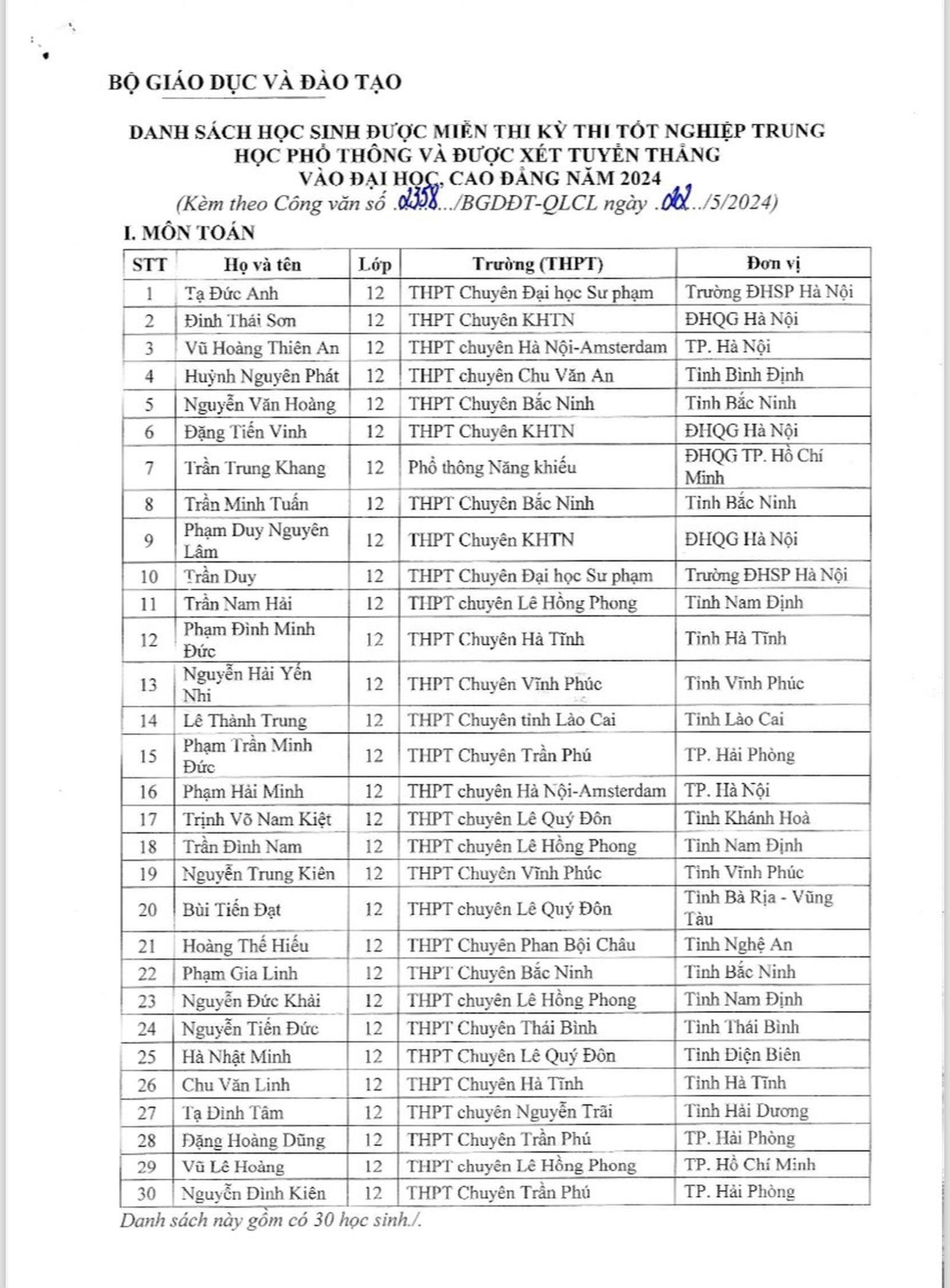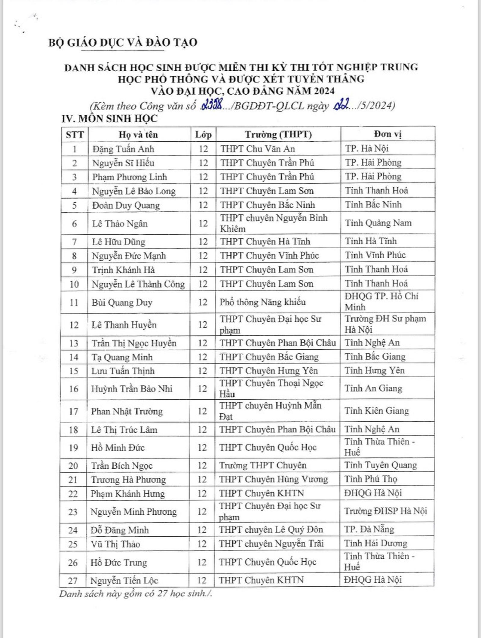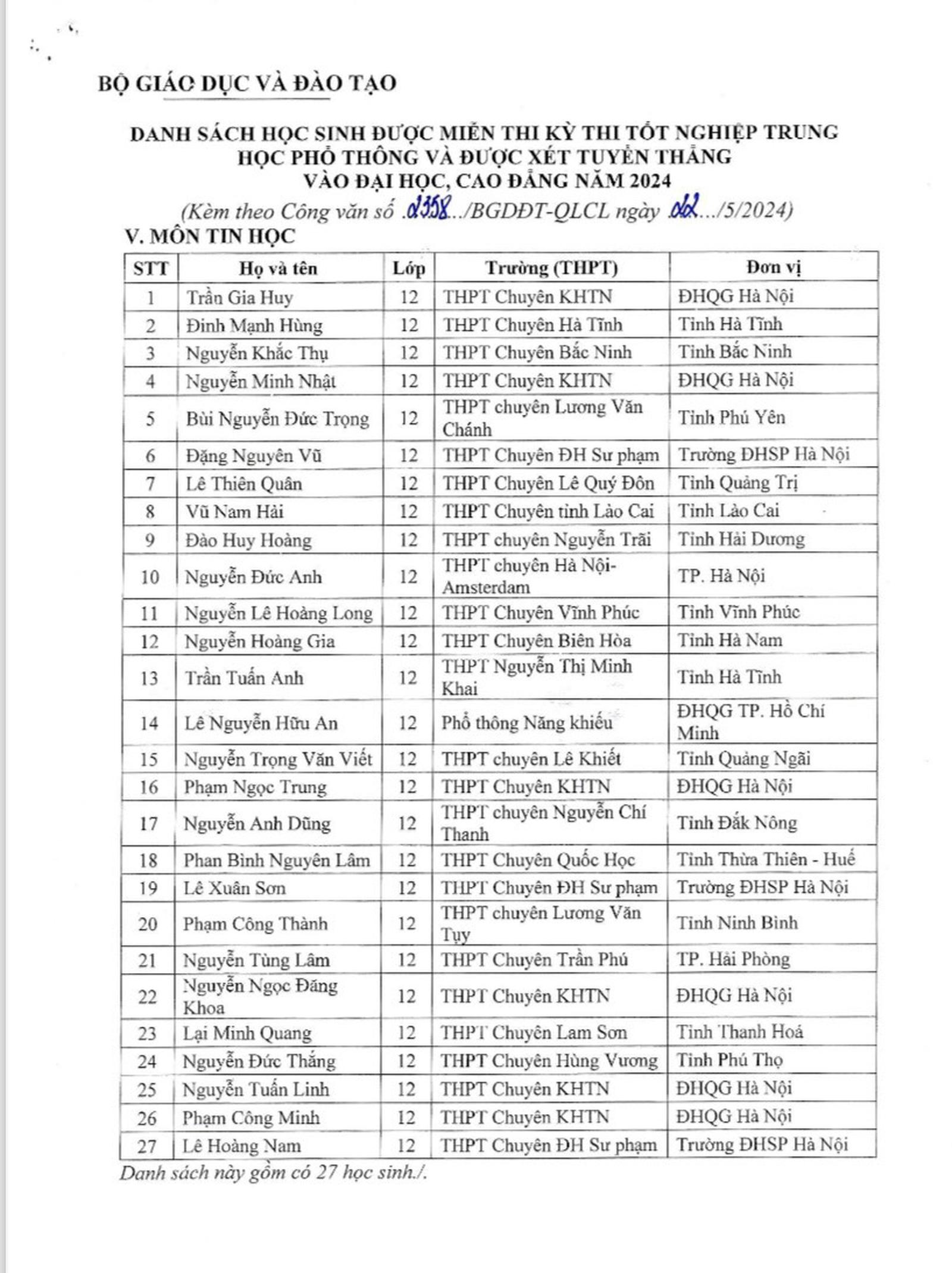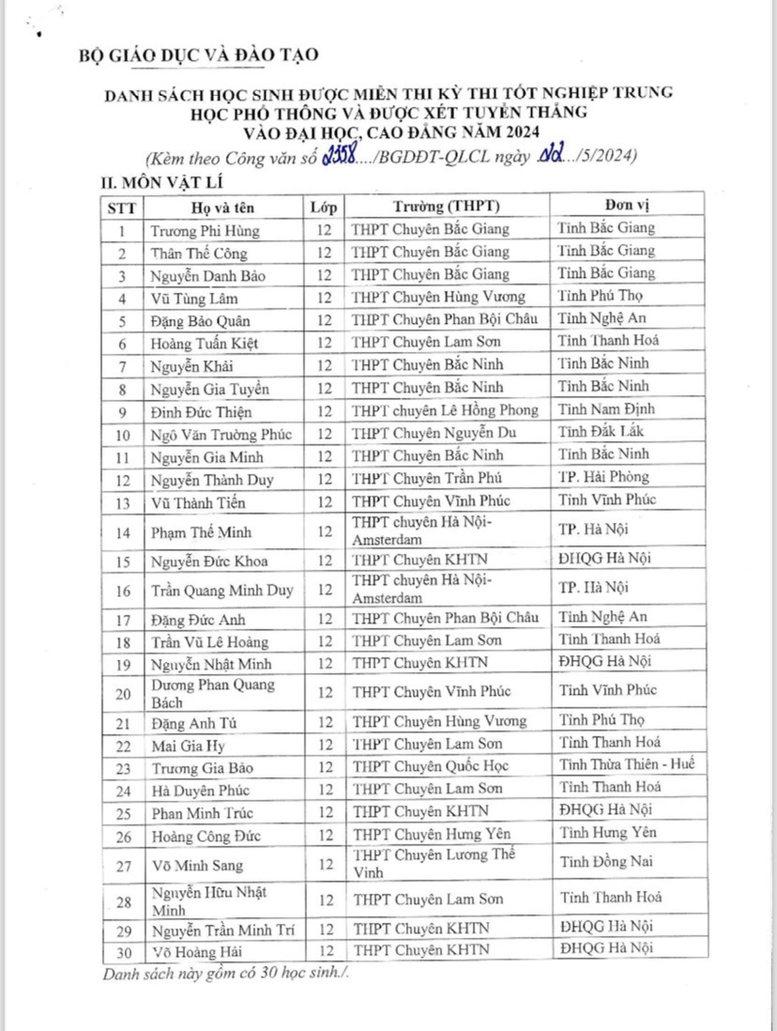 Dưới đây là danh sách 139 học sinh được miễn thi kỳ thi tốt nghiệp THPT 2024: