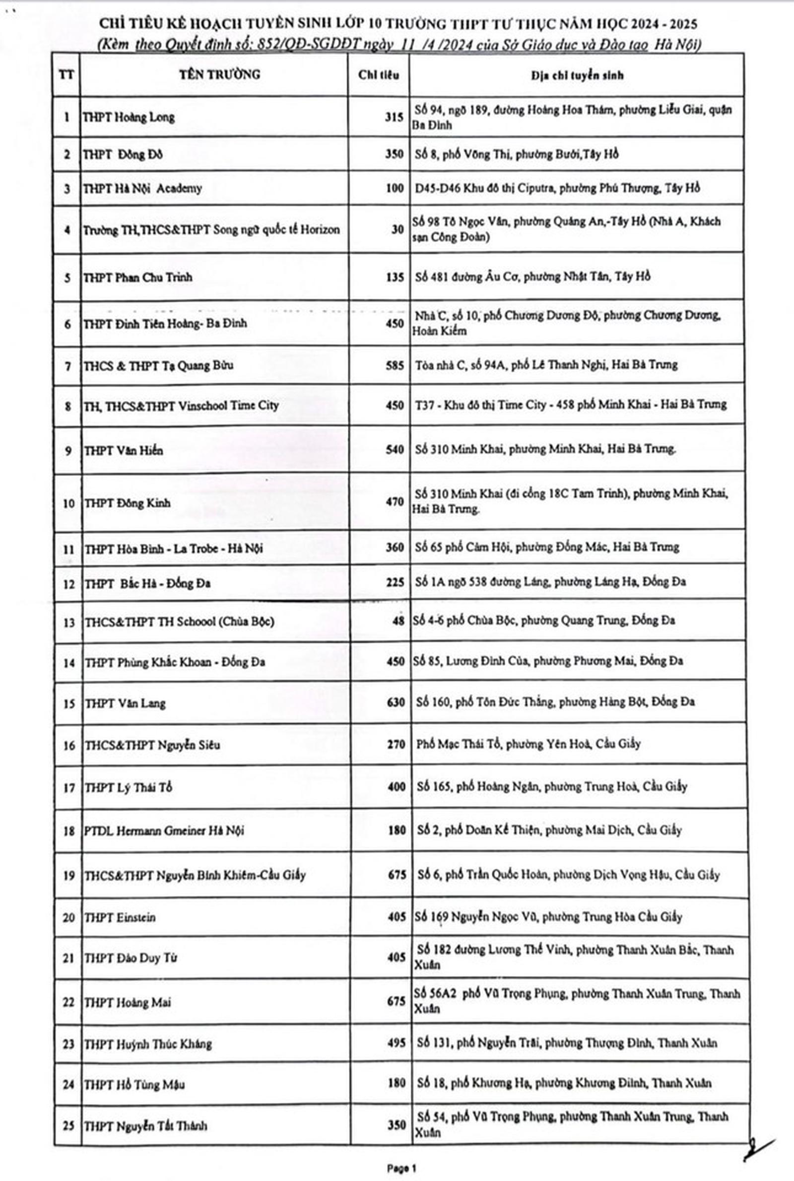 Học sinh căn cứ bảng giao chỉ tiêu tuyển sinh do Sở Giáo dục và Đào tạo Hà Nội công bố để biết được những trường THPT tư thục nào được phép tuyển sinh lớp 10 năm học 2024 - 2025.