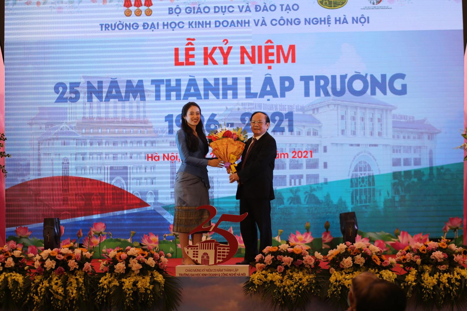 Đại diện Lưu học sinh Lào tặng hoa GS.TS. Đinh Văn Tiến, Phó Hiệu trưởng Thường trực Nhà trường