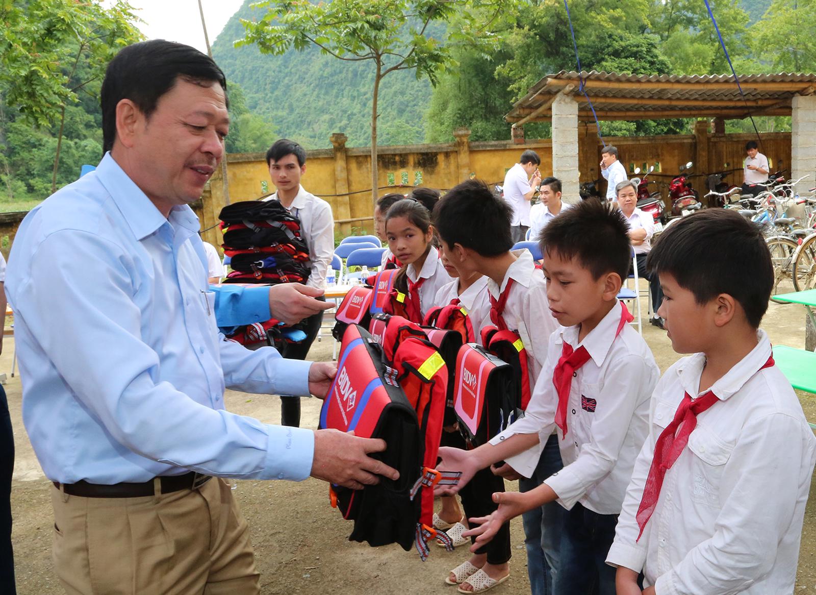 (Thanh tra)- Trong 2 ngày 25 và 26/5/2017, Ngân hàng TMCP Đầu tư và Phát triển Việt Nam (BIDV)phối hợp với Quỹ Bảo trợtrẻ em Công đoàn Việt Namtặng 2.000 cặp phao cứu sinh và 40 triệu đồng cho các em học sinh tạicác trường mầm non, tiểu học thuộc xã Đoài Cônhuyện Trùng Khánh, tỉnh Cao Bằng và trường tiểu học Thanh Vận thuộc xã Thanh Vận, huyện Chợ Mới, tỉnh Bắc Kạn.