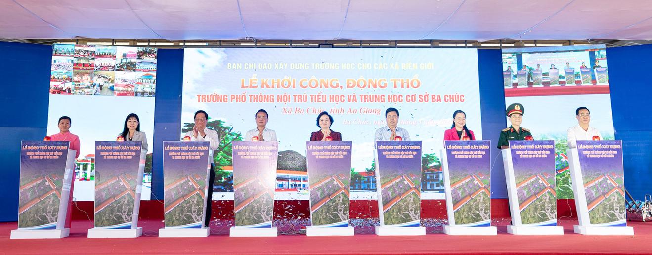 Phó Thủ tướng Phạm Thị Thanh Trà và các đại biểu thực hiện nghi thức khởi công, động thổ Trường Phổ thông nội trú Tiểu học và Trung học cơ sở Ba Chúc. Ảnh: AGO