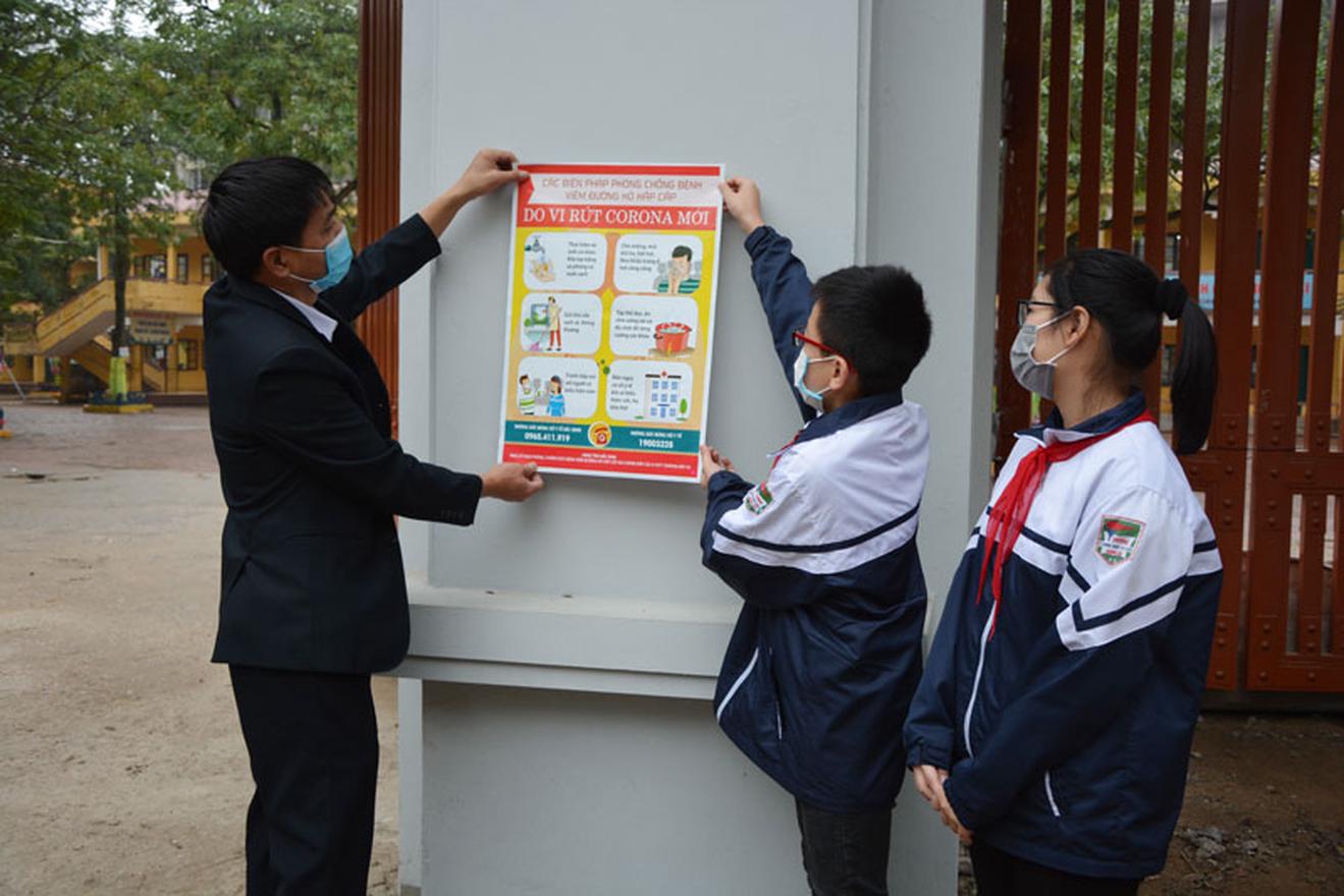Thầy, trò Trường THCS Ninh Xá, TP Bắc Ninh dán áp phích tuyên truyền về cách phòng, chống Covid-19. Ảnh: Xuân Me