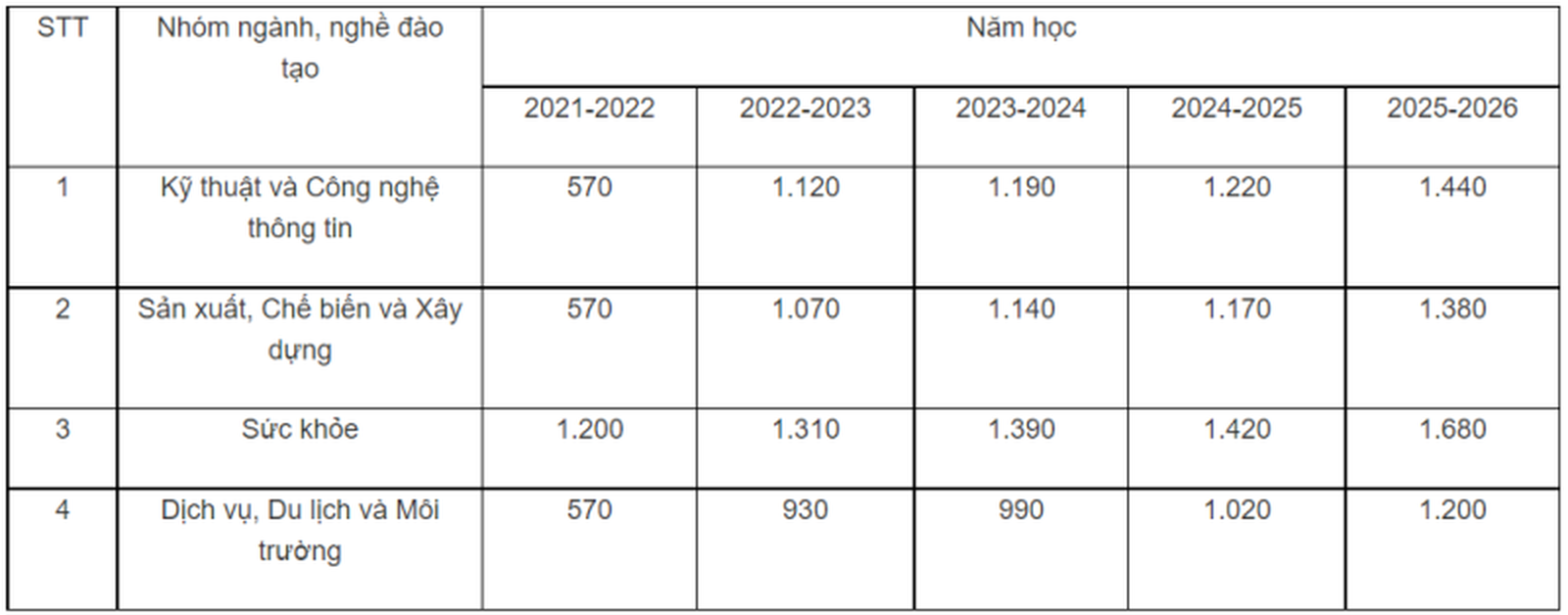 Theo nghị quyết, tỉnh sẽ hỗ trợ học sinh, sinh viên học trình độ cao đẳng, trung cấp đối với 29 ngành, nghề có nhu cầu lao động lớn thuộc 4 nhóm ngành, nghề: Kỹ thuật và công nghệ thông tin; sản xuất, chế biến và xây dựng; sức khỏe; dịch vụ, du lịch và môi trường. Cụ thể: